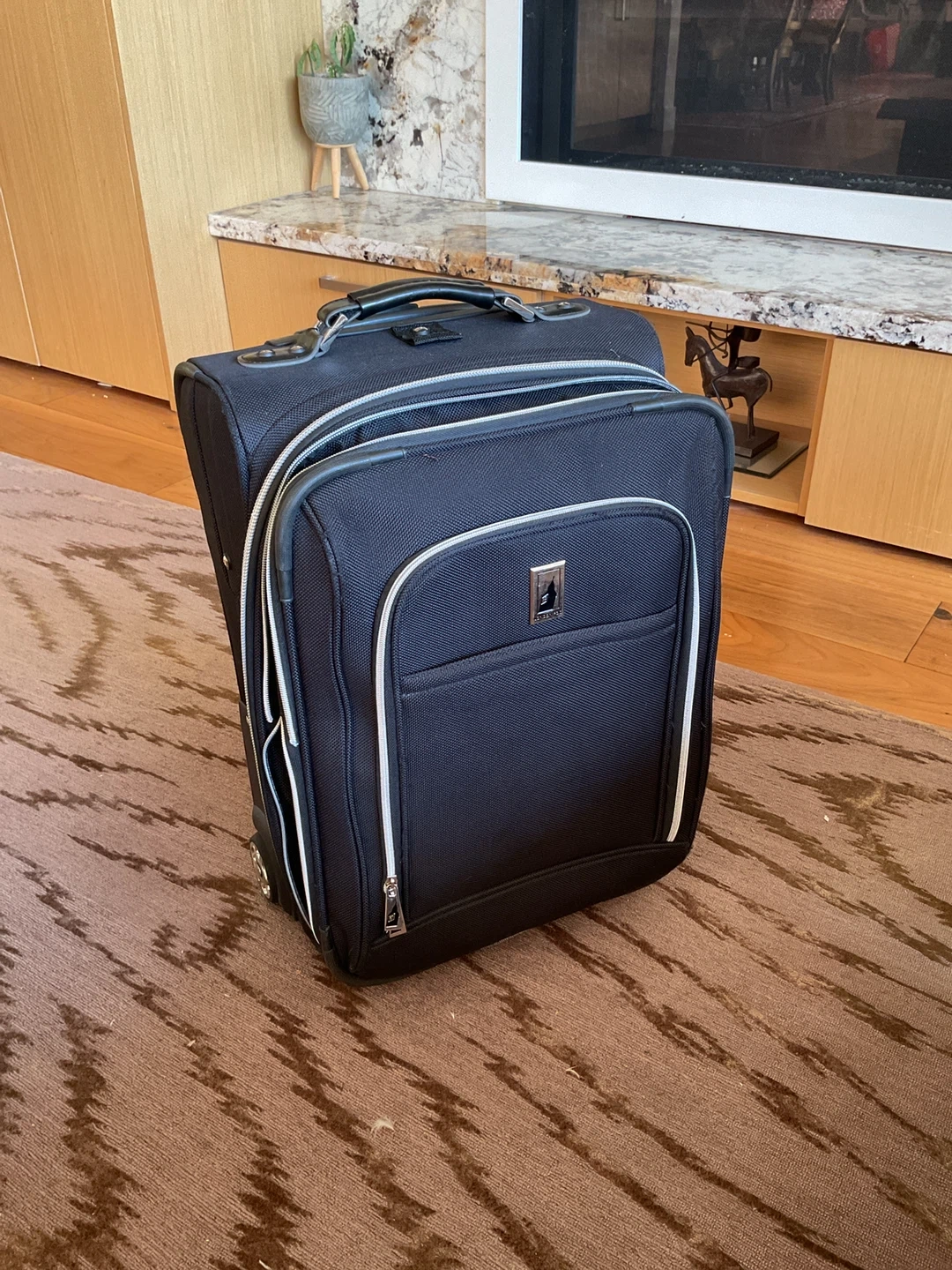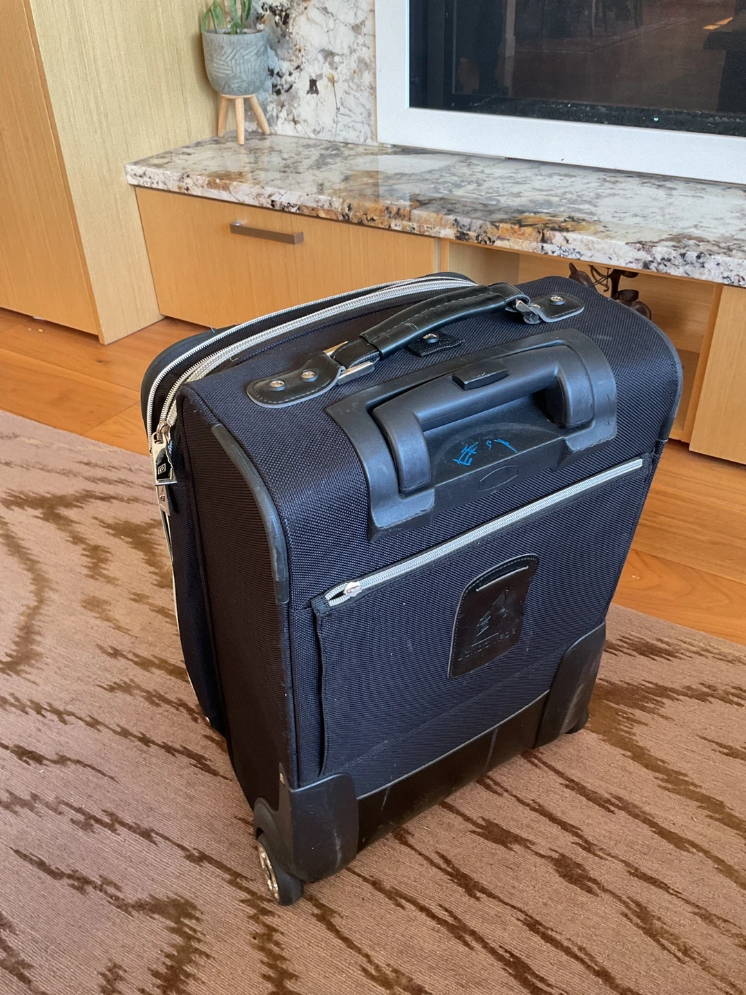 This is a London Fog black rolling suitcase. It's in great shape and ready for your next trip! It features a telescoping handle and smooth-rolling wheels for easy maneuverability. Only problem is that the zipper which closes the expansion doesn’t work. Other than that it is ready to roll.