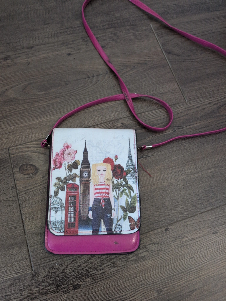 10Cute crossbody bag with a London/Paris theme! It features images of the Eiffel Tower, Big Ben, and a classic red telephone booth. The strap is a vibrant pink, and the bag itself has a fun, youthful design