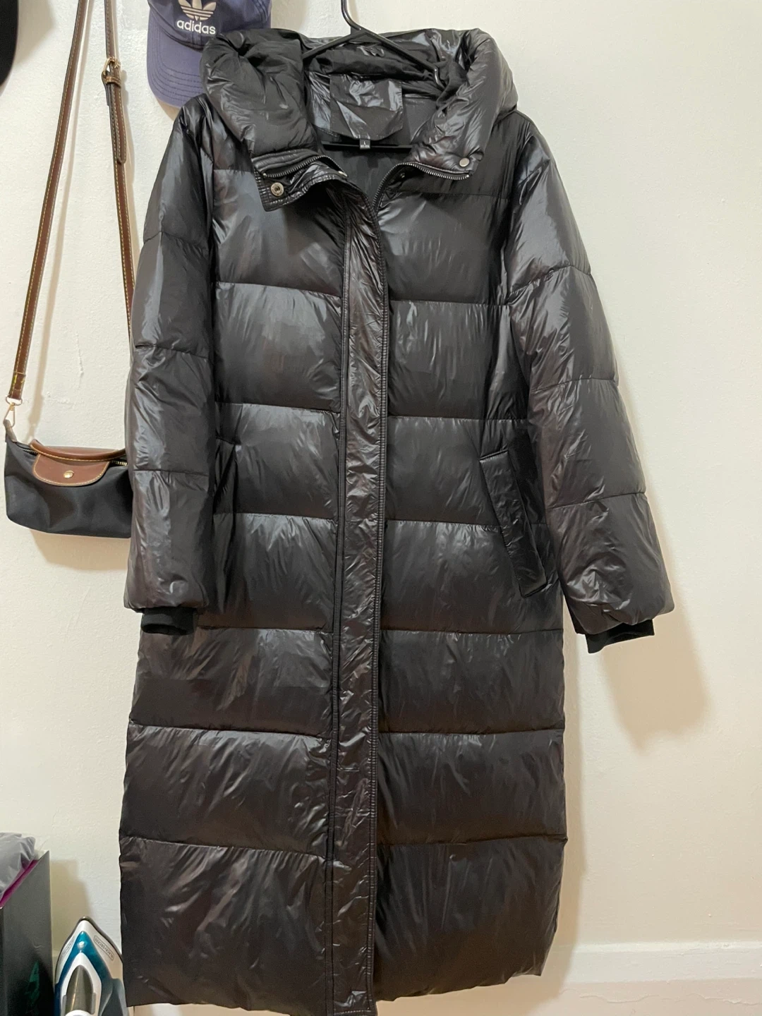 Selling a long black goose down coat! It's super warm. Size L but runs small ( S or small M)