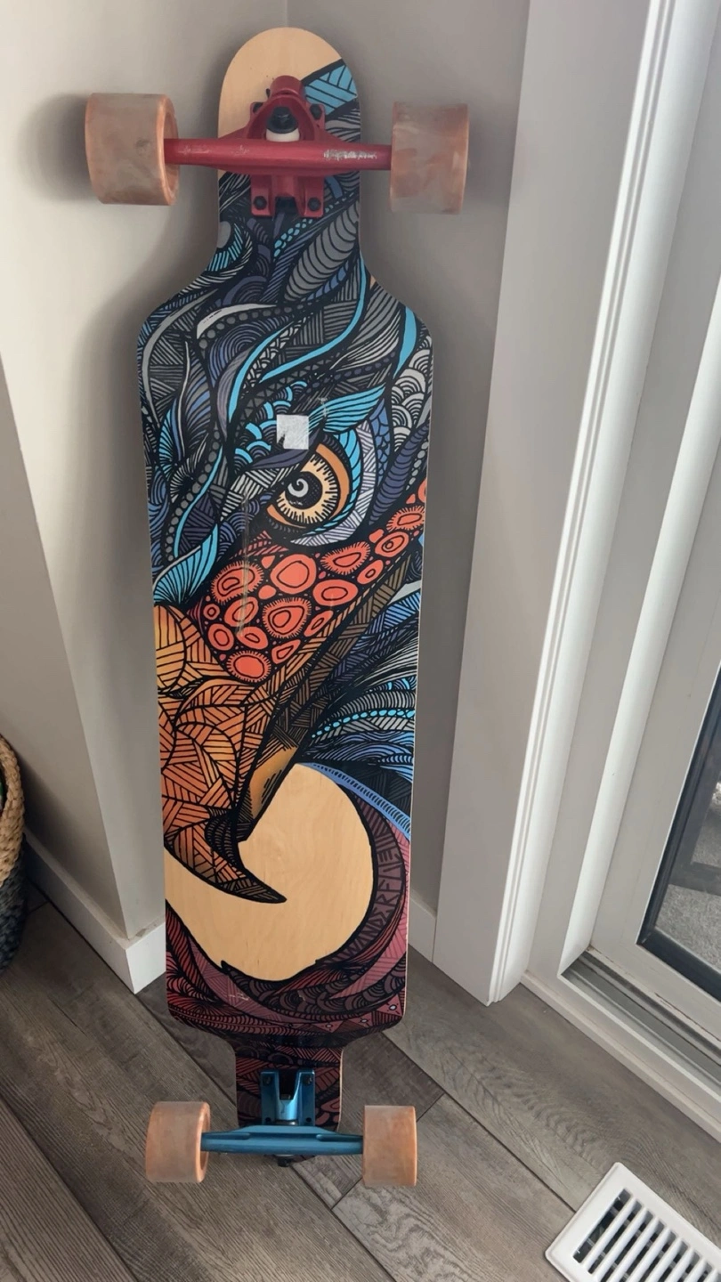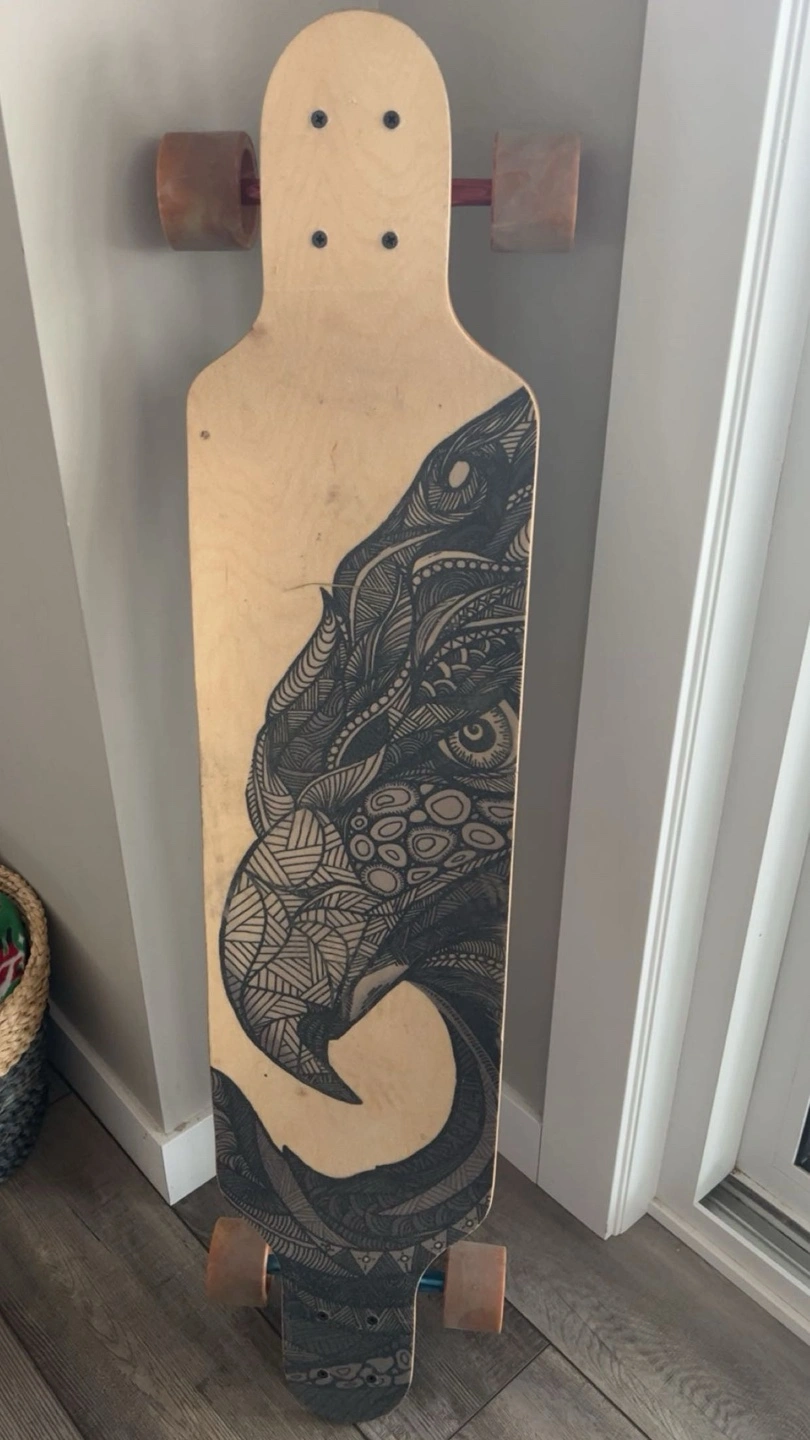 Selling a longboard skateboard featuring a eagle design. It's in good condition and ready to ride