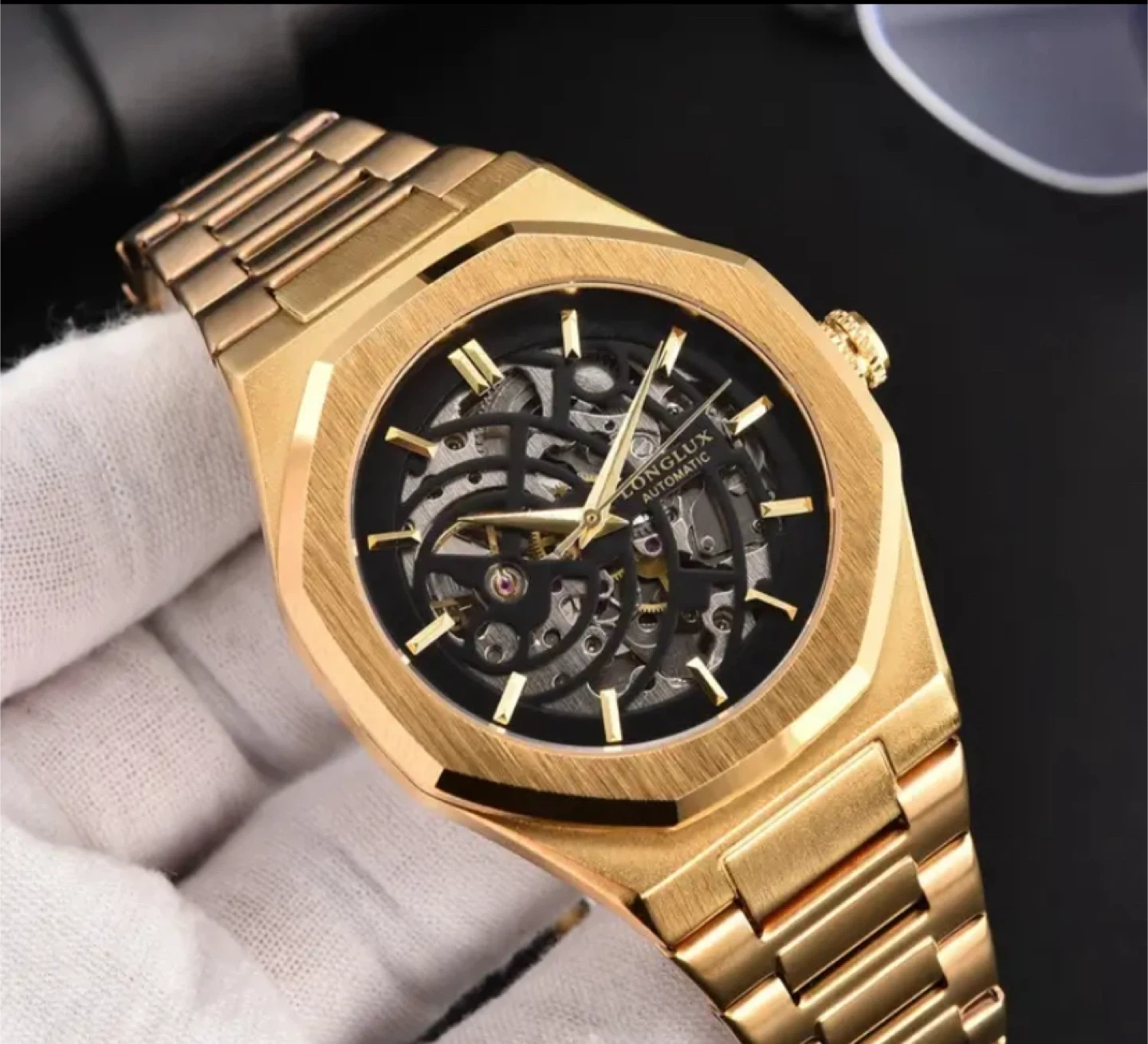 Selling a Longlux automatic watch in gold! The watch features a skeleton dial, showcasing its intricate inner workings. It's a stylish timepiece that's sure to catch the eye