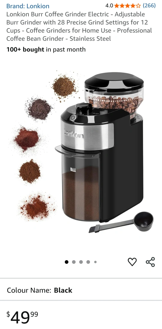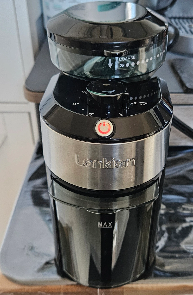 I'm selling a Lonkion Burr Coffee Grinder! It's an electric adjustable burr grinder with 28 precise grind settings. It can grind enough for up to 12 cups of coffee. It's made of stainless steel and is in great condition. The model number is CBG-8002. Originally bought for $49.99