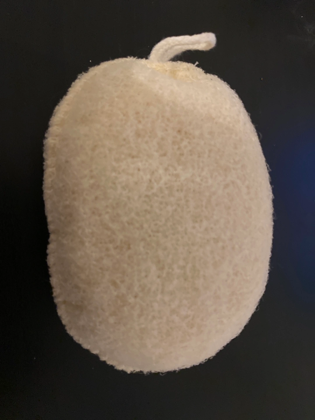Natural loofah scrubber with a string for hanging. Gently exfoliates skin.