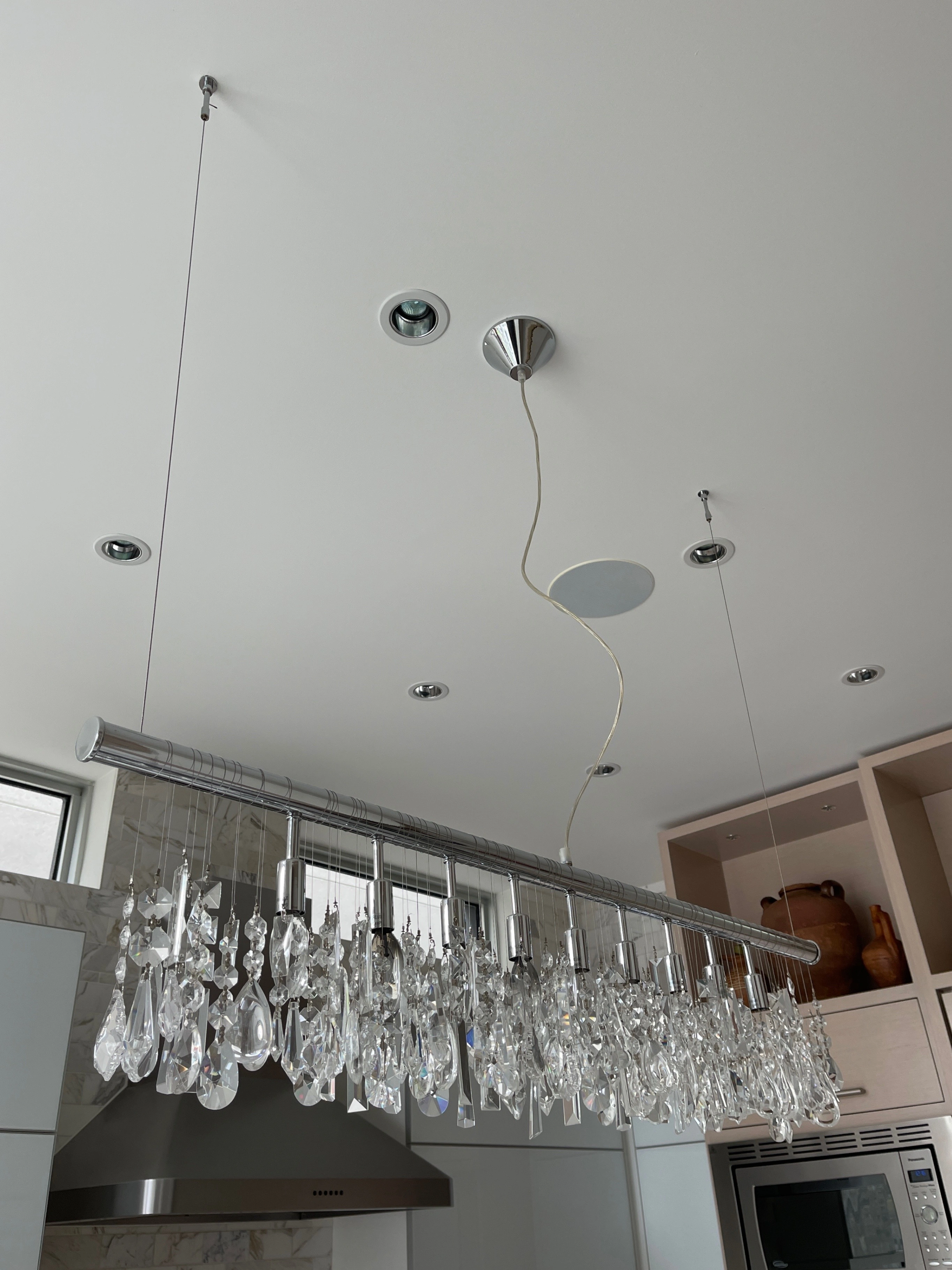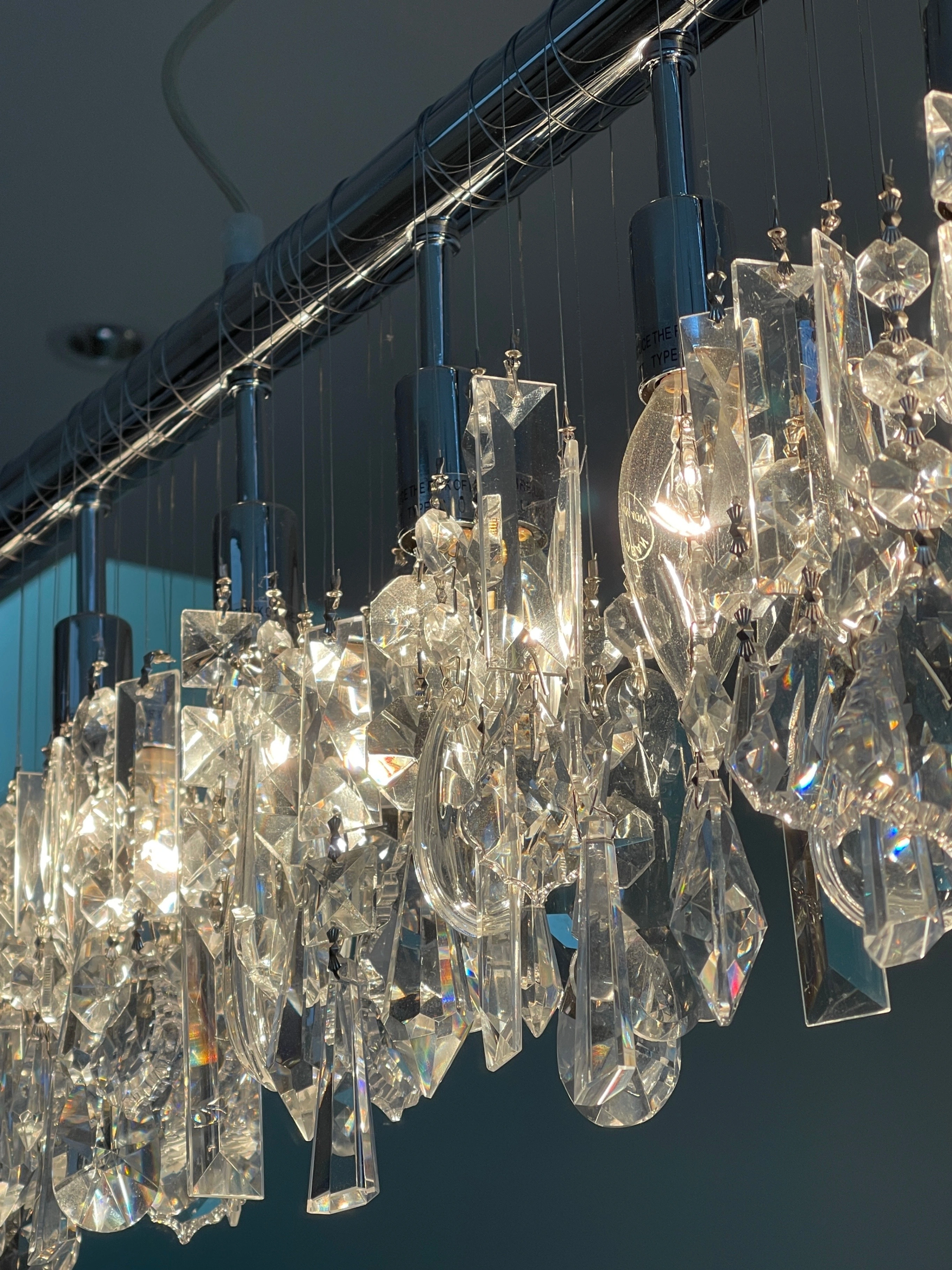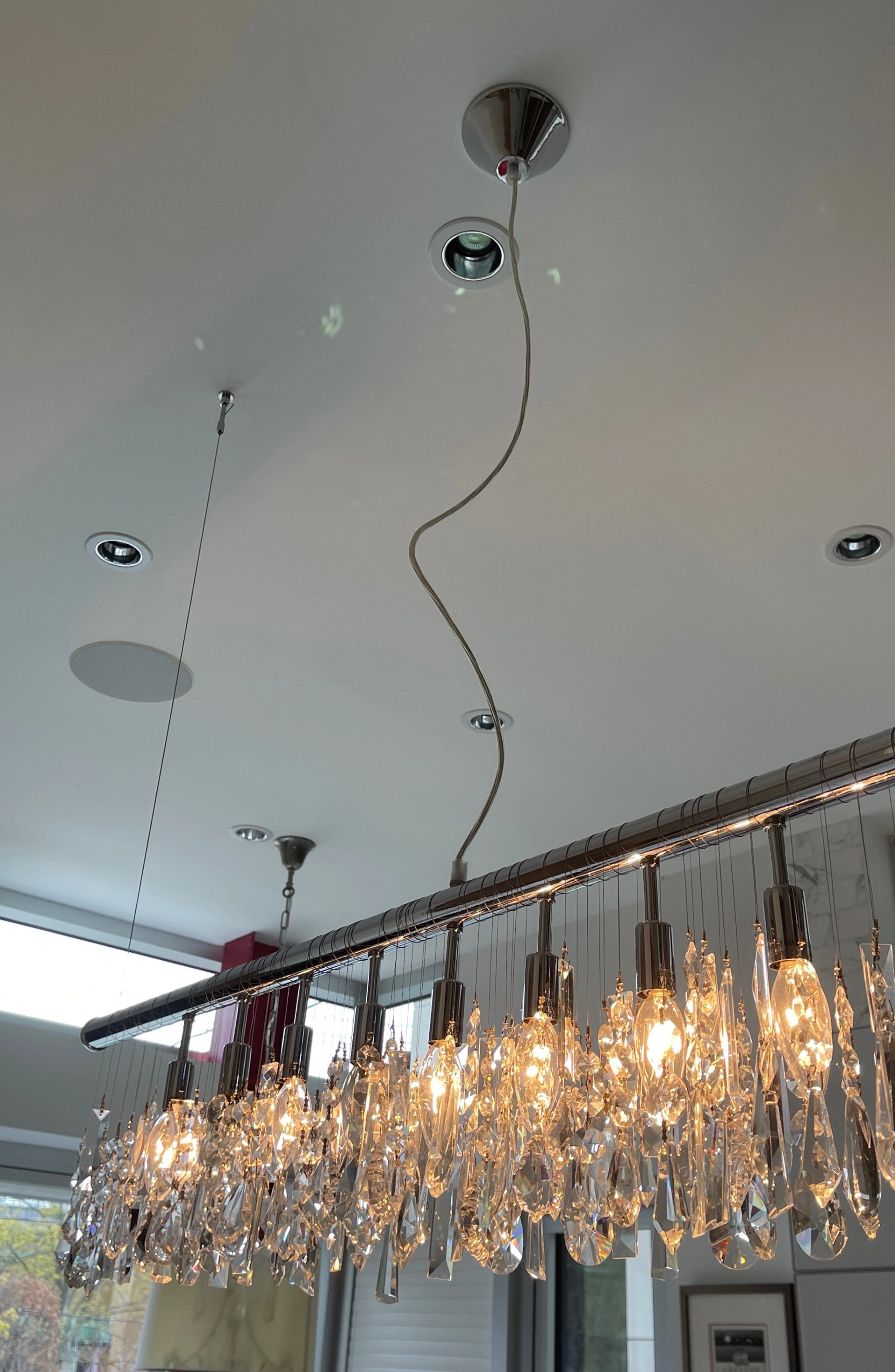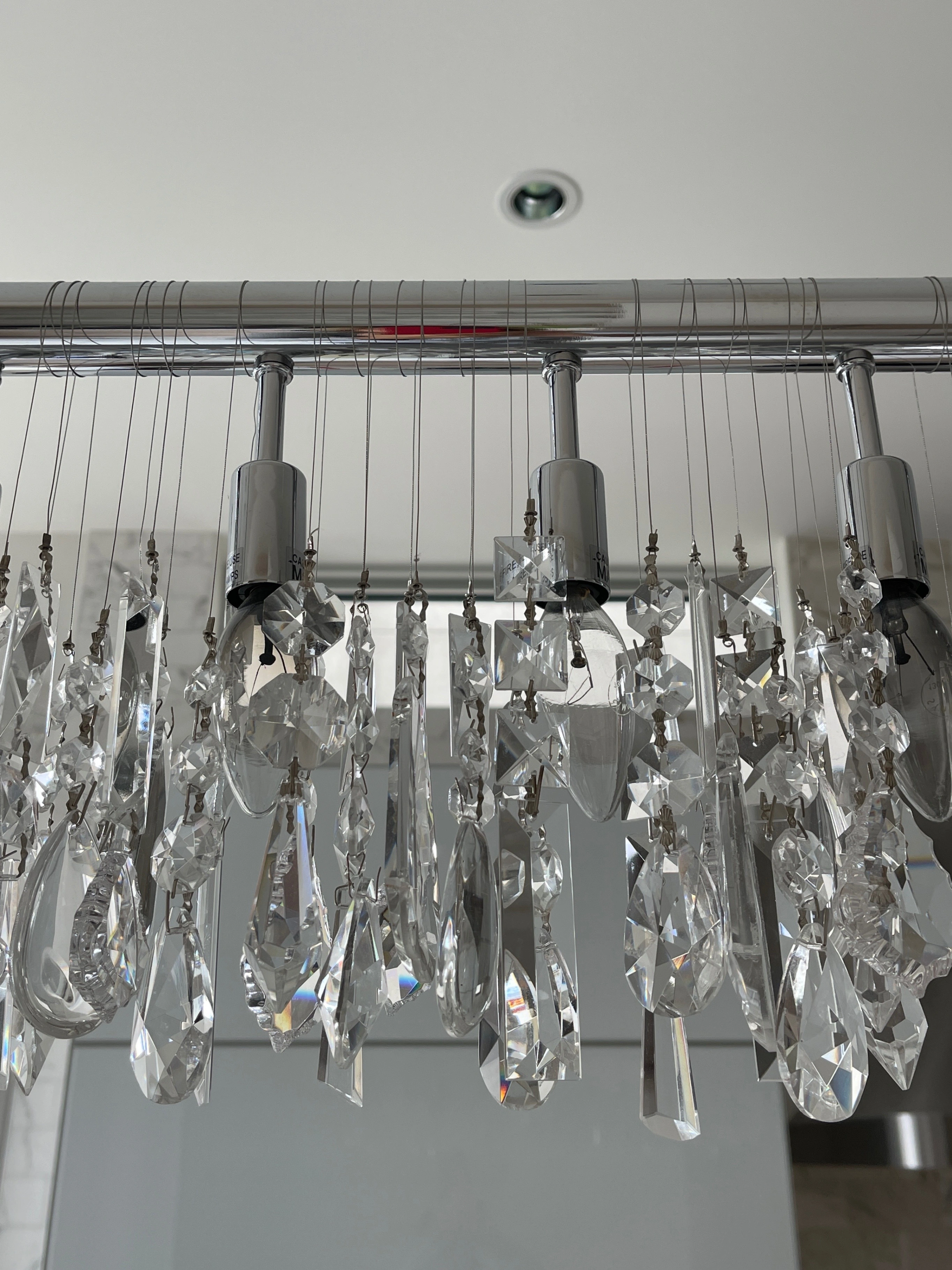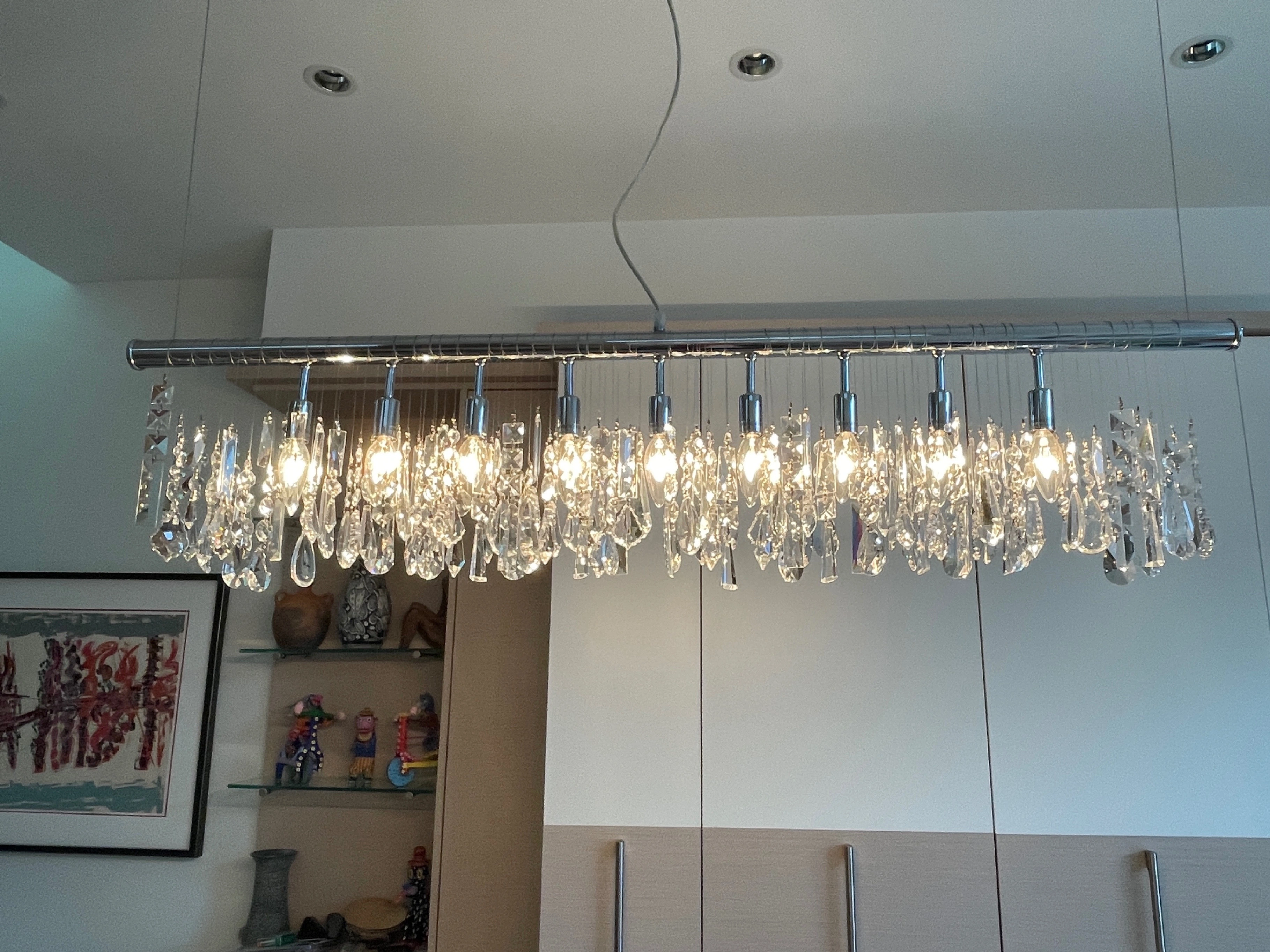 This is the design that brought the crystal chandelier into the 21st century. Not a cheap copy (of which there are lots), James Moder's "Broadway" Crystal Chandelier will bring sparkle and shine to your contemporary decor. This linear chandelier is 47" long and works well over a kitchen island or your dining room table. It has 9 candelabra bulbs, which provide plenty of illumination, and 50 double strands of Real Crystals, not plastic or lucite, to provide that touch of glam. The body of the chandelier is finished in shiny silver, as is the ceiling canopy. Two additional ceiling wires provide support, as with all the crystals in place, the fixture weighs 16 lbs. We are changing up the decor in our home, so regretfully we've decided that the lighting has to change too. Originally purchased for $1,200 plus HST, we are selling this lovely chandelier for $300. From a smoke-free, pet-free home, this chandelier is in perfect condition, and the crystal strands are individually packed for their safe journey to your home! Pick up in the Avenue Road & St. Clair area.