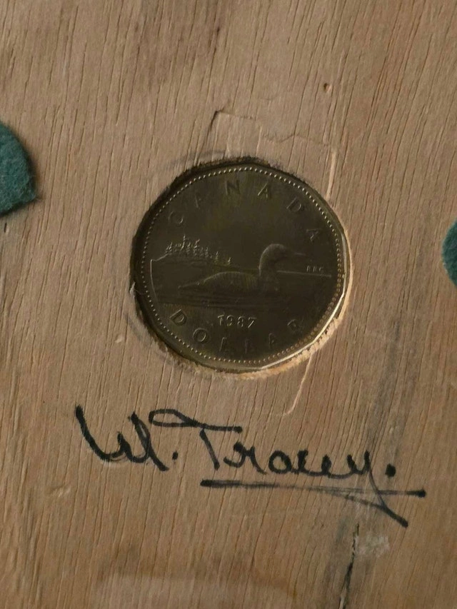 119I'm offering a beautiful, used Loon Carving by Master Carver Weldon Tracey, showcasing exquisite detail and craftsmanship. This unique piece captures the serene essence of the iconic Canadian loon, perfect for collectors and nature enthusiasts alike. Note that because this is a used item, minor imperfections might be visible, adding to its unique character. This carving could easily be the quirky conversation starter you never knew you needed! And hey, just so you know, if the ad is still up, the loon is still waiting to find its new pond! Based on similar carvings, I estimate the value to be around $250 CAD.