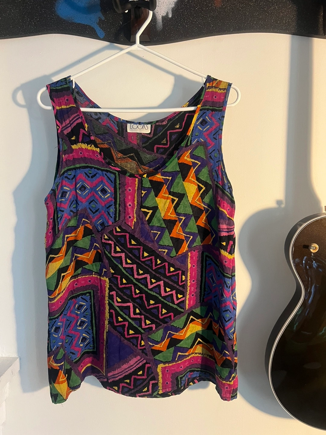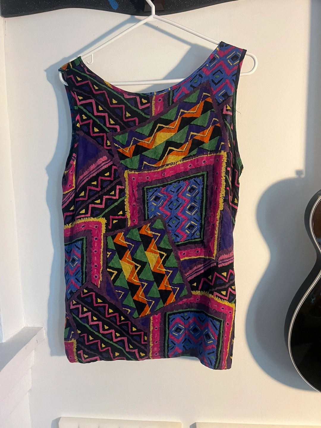 Vibrant colourful geometric print. Loose-fitting sleeveless top. Great for layering or wearing on its own. Unique 90s style.