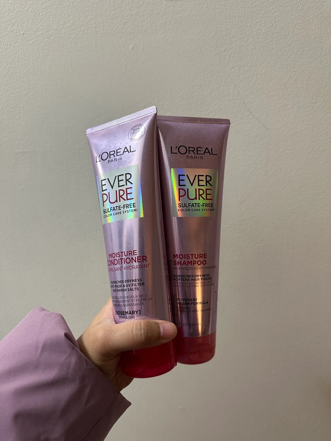 New L'Oréal Paris EverPure sulfate-free shampoo and conditioner. Rosemary and vegan formulas.