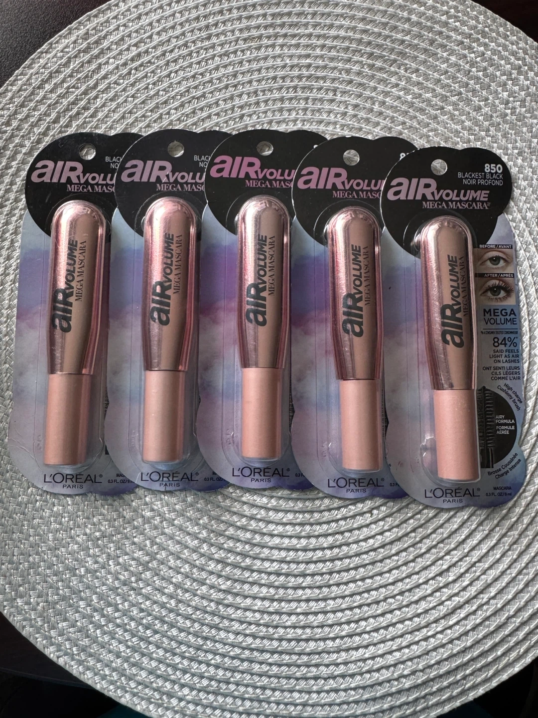 Selling new L'Oreal Air Volume Mega Mascara in Blackest Black. This mascara features an airy formula that feels light as air on your lashes. The cushiony brush provides a high charge for intense volume. Get mega volume with this great mascara!