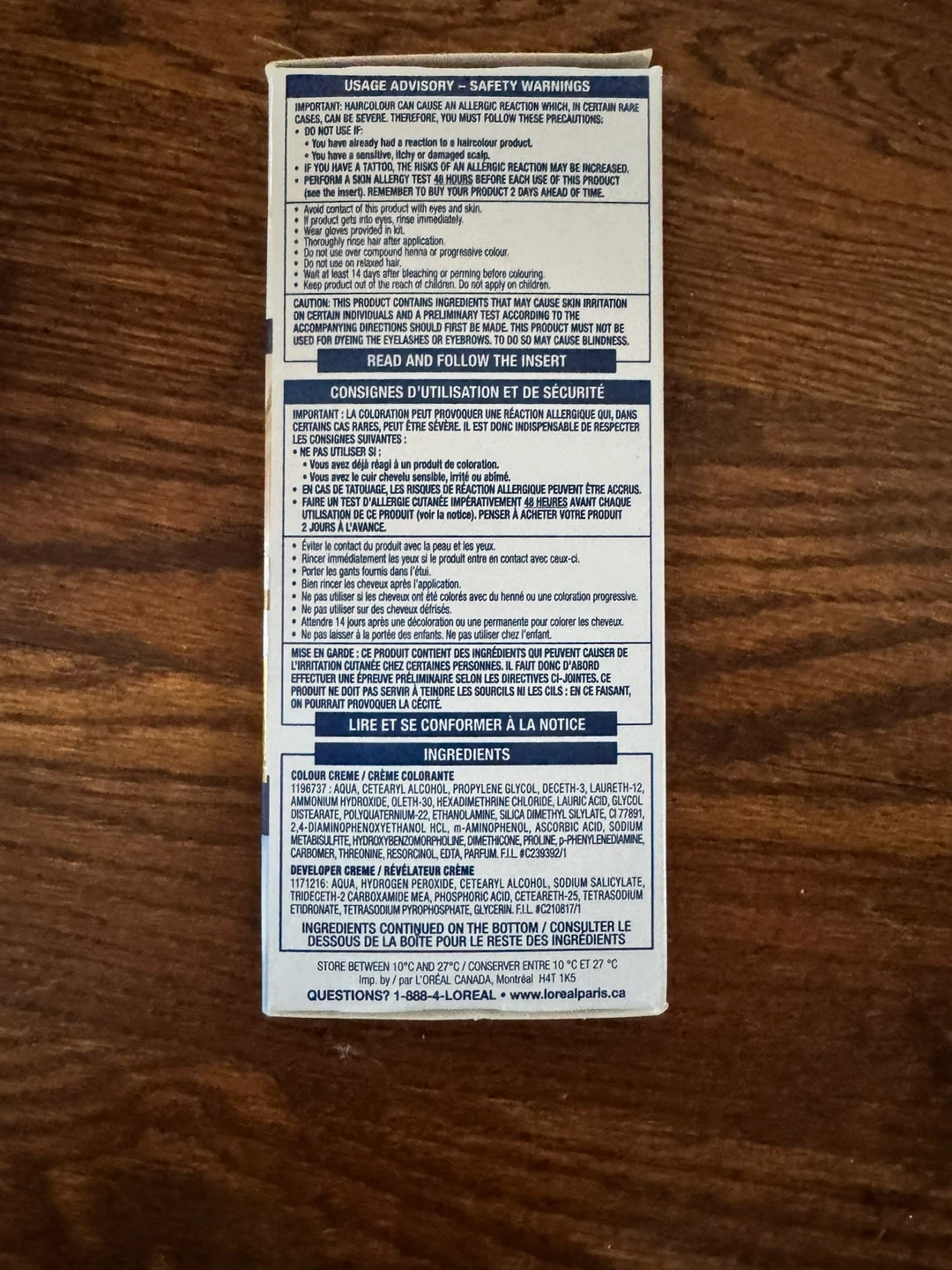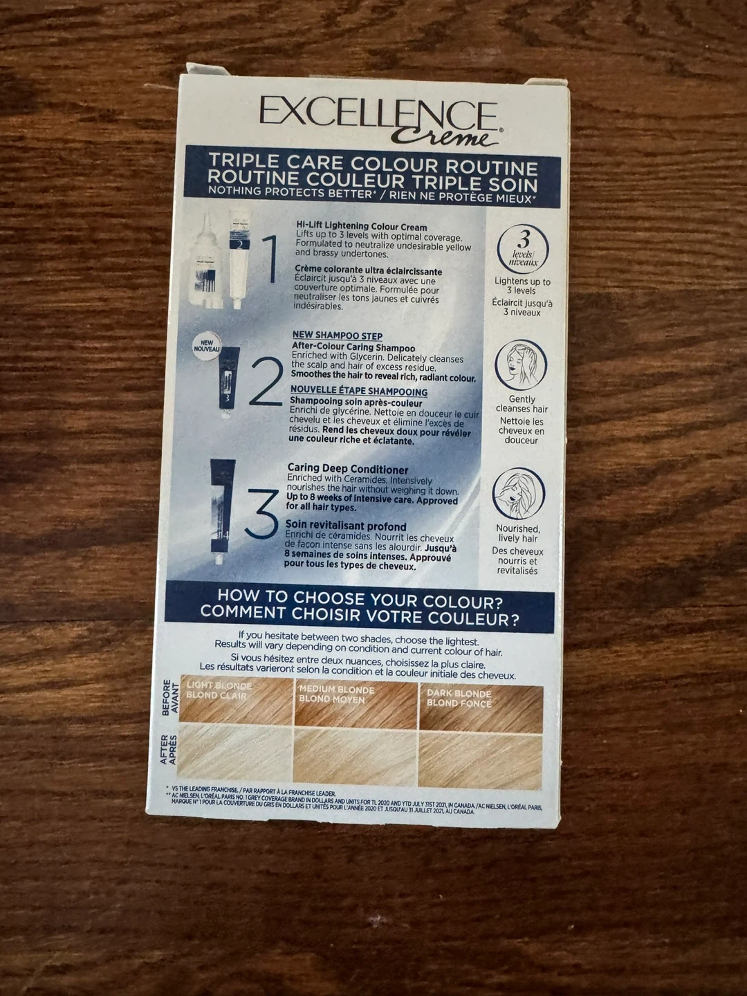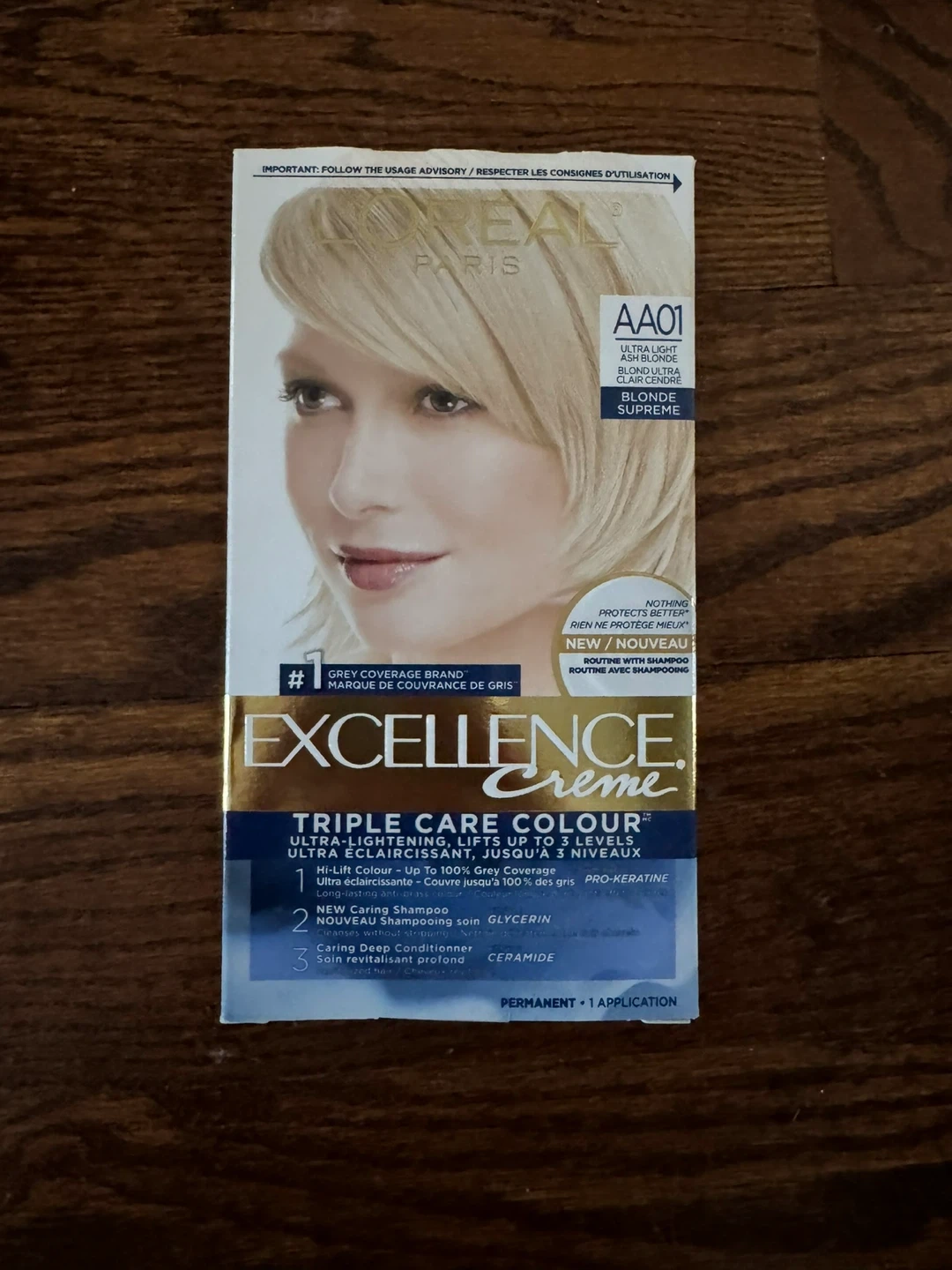 55Selling a box of L'Oreal Excellence Triple Care Colour Creme in AA01 Ultra Light Ash Blonde. This hair dye provides triple protection for your hair during the colouring process. The box includes the Hi-Lift lightening colour cream, after-colour caring shampoo, and caring deep conditioner for nourished and radiant hair. Get up to 3 levels of lift with optimal coverage. Perfect for achieving a beautiful blonde supreme look! Price for each $10 5 packs are available Retail price: 18.99 +tax