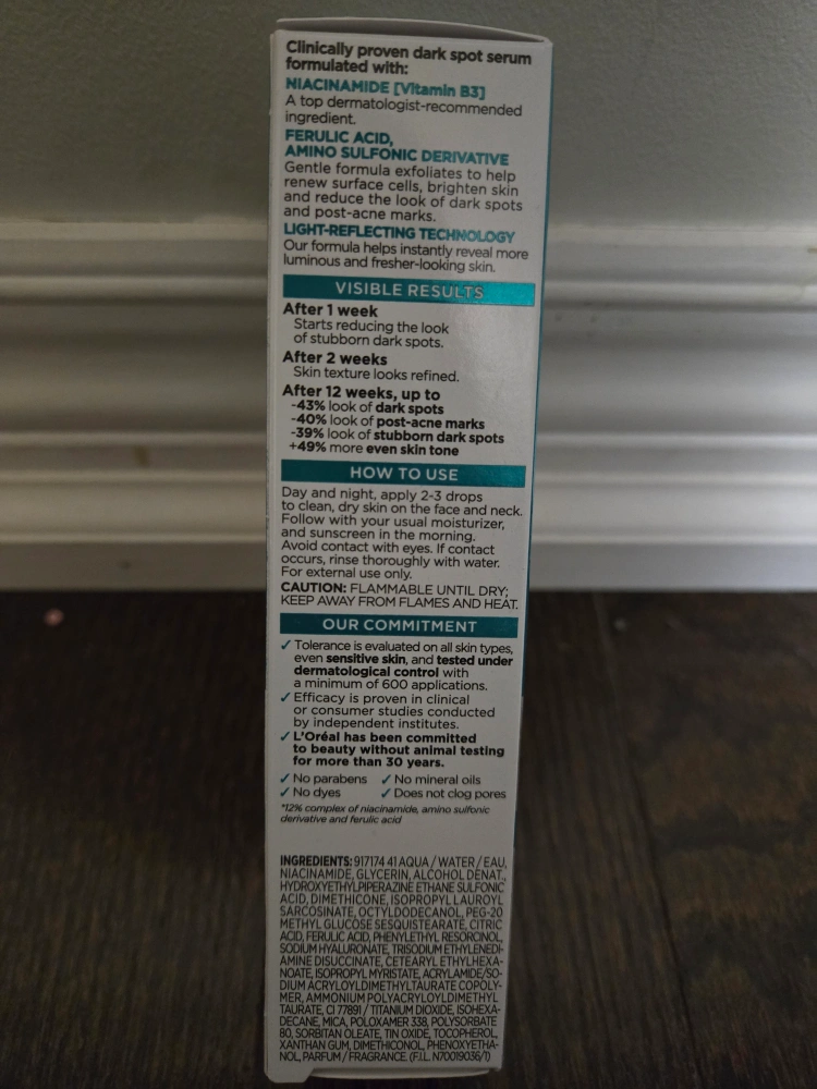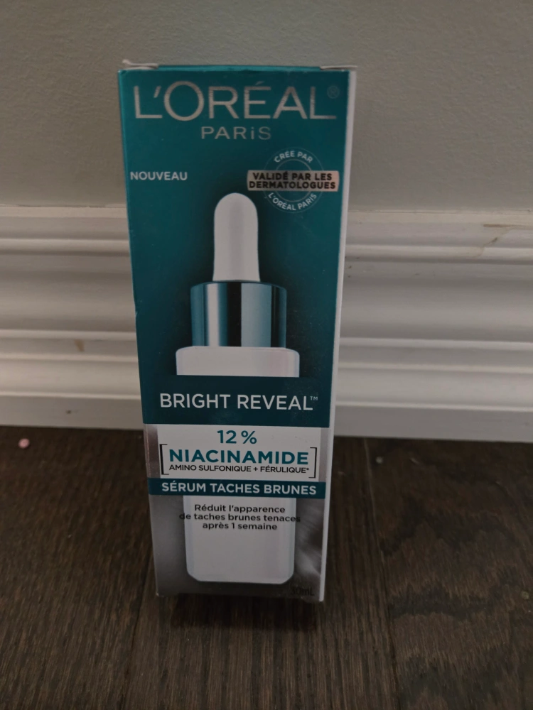 I'm selling a L'Oreal Paris Bright Reveal 12% Niacinamide Serum. This serum reduces the look of dark spots and post-acne marks. After 1 week, skin starts reducing the look of stubborn dark spots. After 2 weeks, skin texture looks refined. It helps to reveal more luminous and fresher-looking skin