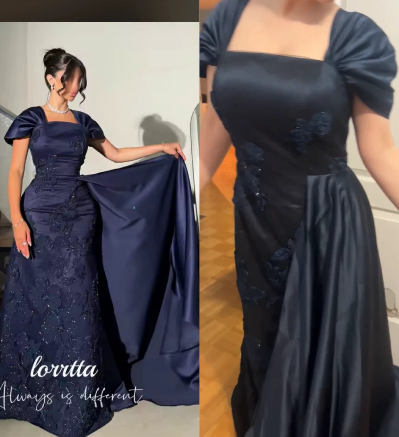 10Beautiful navy blue formal dress by Lorritta. It features a unique design with floral embellishments. Perfect for a special occasion!