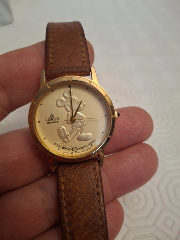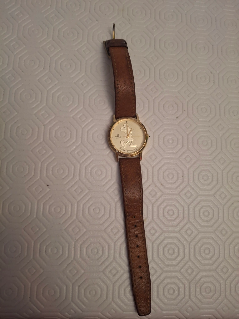 Selling a Lorus quartz watch featuring Mickey Mouse! The watch has a gold-tone bezel and a brown leather strap. The back of the watch indicates a base metal bezel and stainless steel back.