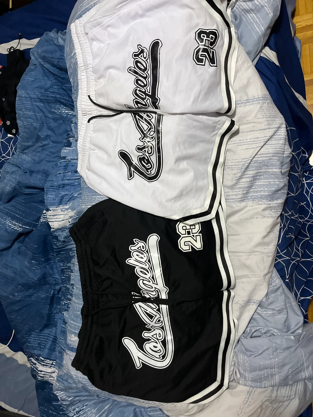 10Selling a pair of basketball shorts with a 'Los Angeles' design and the number 23 on them. One pair is black and the other is white. They're in great shape and ready for a new home! Fits 2 sizes down says xxl rlly is L
