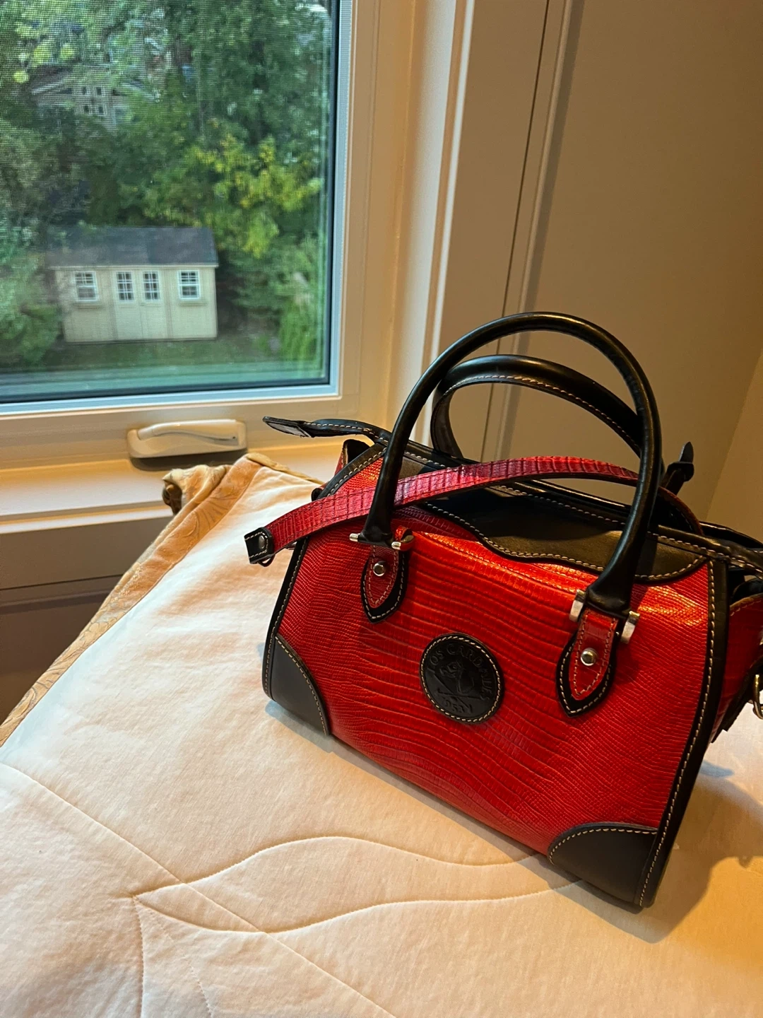 10Selling a Los Cabos handbag with a striking red lizard print. It has black trim and handles, giving it a classic look. This bag is perfect for adding a pop of colour to any outfit