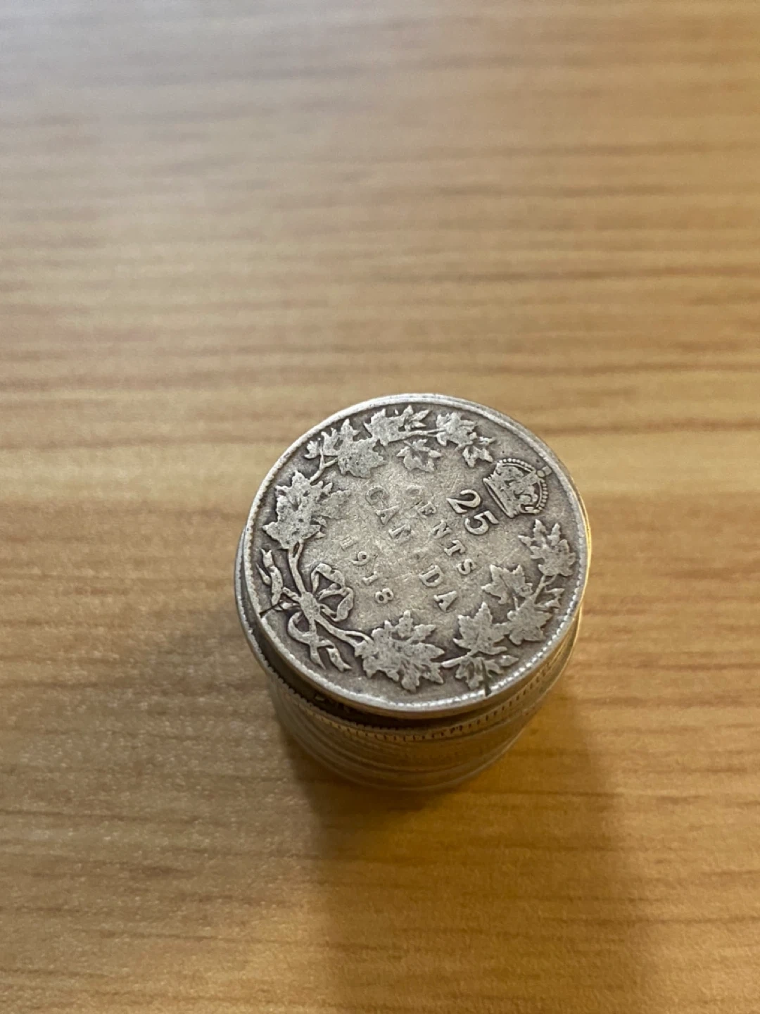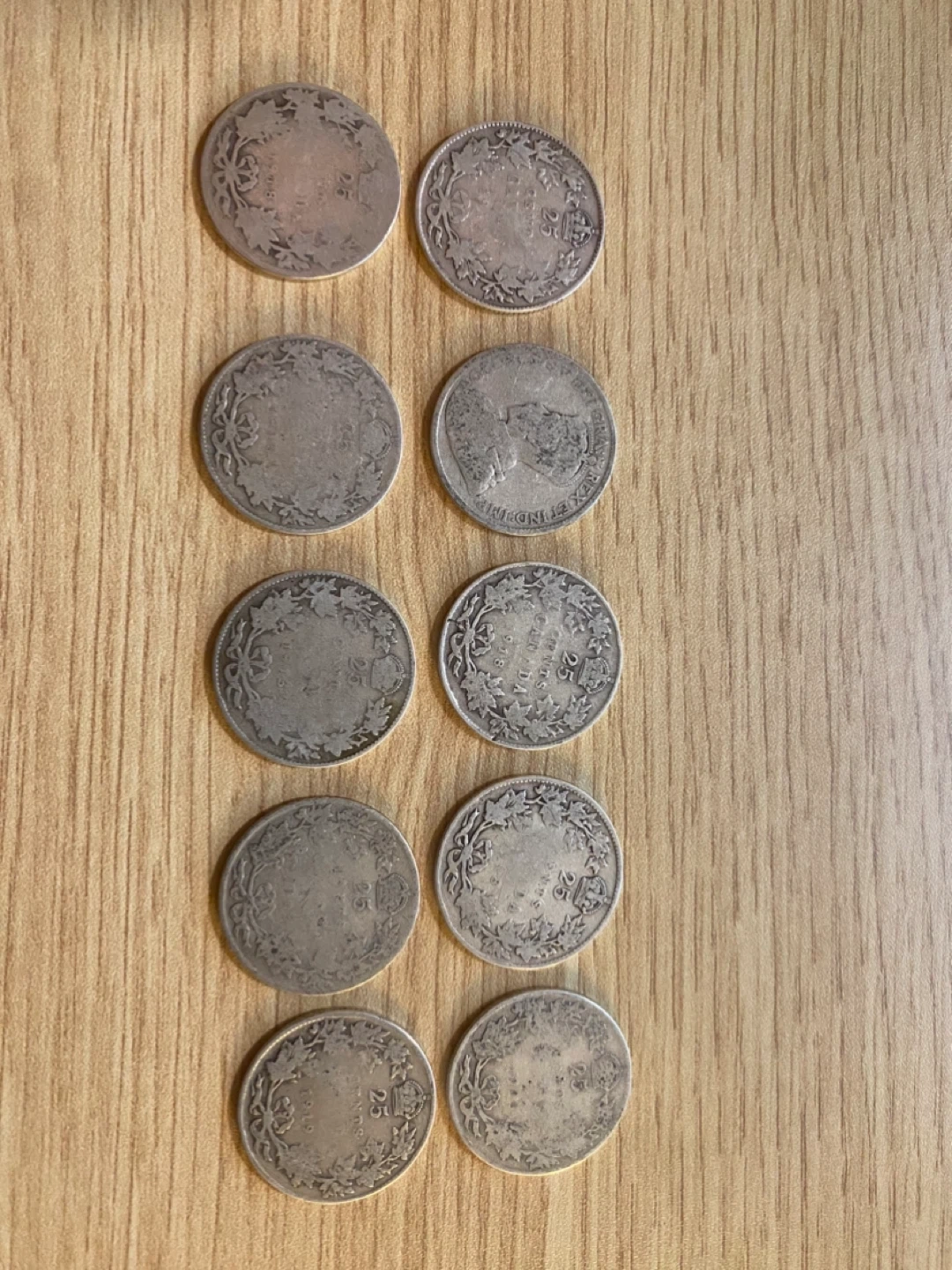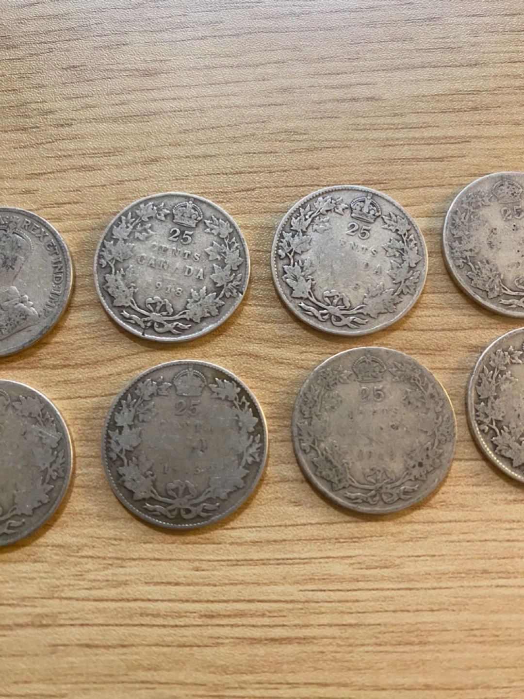 Selling a collection of 10 vintage Canadian 25 cent coins. They show signs of wear consistent with their age, but they have historical and silver value. They are all from the 1910s and made from .925 silver