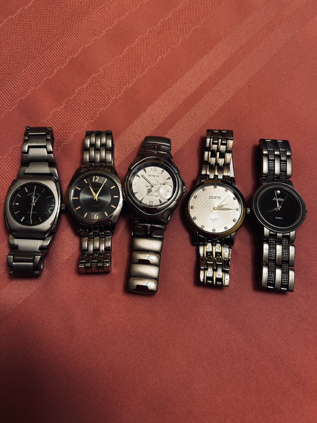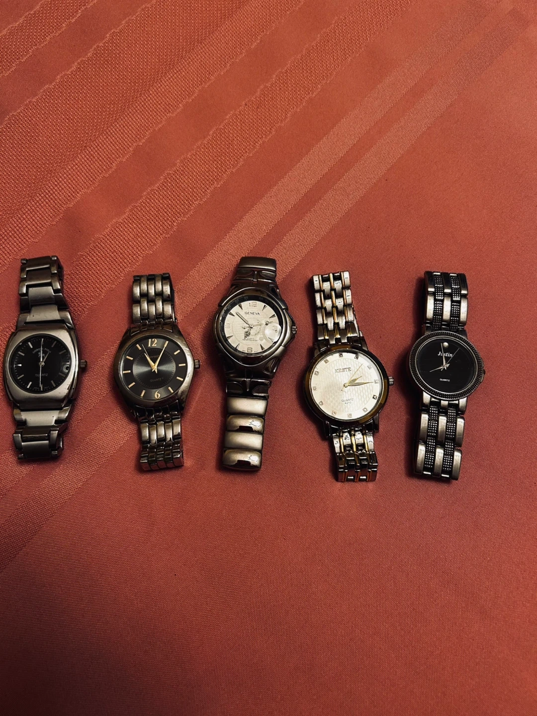 74Selling a lot of 5 assorted watches. Brands include Geneva, Quartz, Keste, and Justin. All watches are in used condition. Great for parts or repair Batteries needed