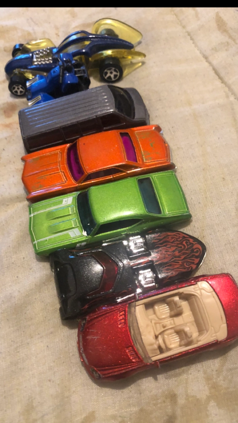 Selling a lot of 6 used Hot Wheels cars. There are some signs of wear, but they're still fun to play with!