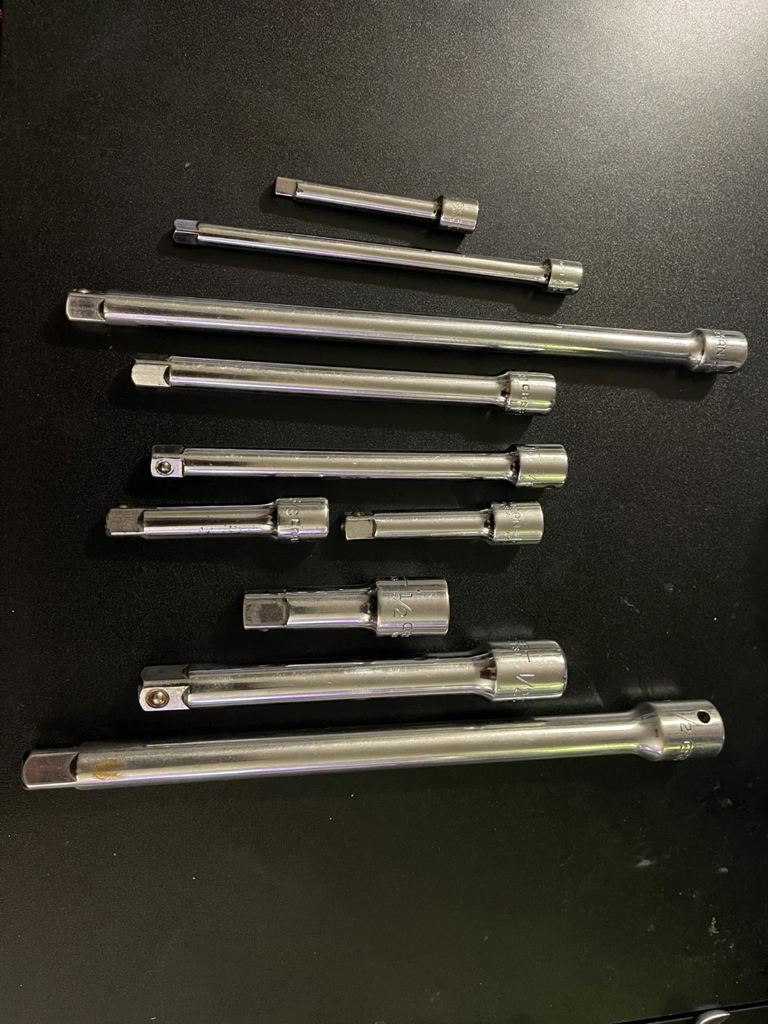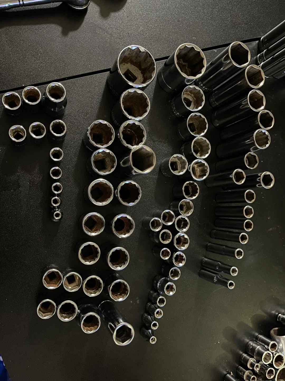 39Sparkplug – 5/8 (2), 13/16 Extenders ½” – 3”, 6”, 10” 3/8” – 3”(2), 6” (2), 10” ¼” – 3”, 6” Imperial 6pt tall – 2 drive sizes 3/8” – ¾, 11/16, 5/8, 9/16(2), 7/16 ¼” – ½, 7/16, 3/8, 11/32, 5/16, 9/32, ¼, 7/32, 3/16 Imperial 12pt short – 3 drive sizes ½” – 1-1/16 3/8” – 13/16, ¾, 11/16, 5/8(2), 9/16, ½, 3/8, 7/16(2), 5/16, ¼ ¼” – 3/8, 11/32, 9/32, 5/16, 7/32, 3/16, 5/32 Metric 12pt (mix of heights) – 3 drive sizes ½” – 30, 22, 19, 17, 15(tall), 14, 13, 12, 11 3/8” – 19, 18 (tall and short), 17, 15, 14, 13, 12 (tall and short), 11, 10 1/4” – 13(2), 12, 11, 10(2), 9, 8, 7, 6, 4