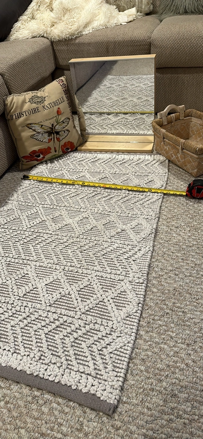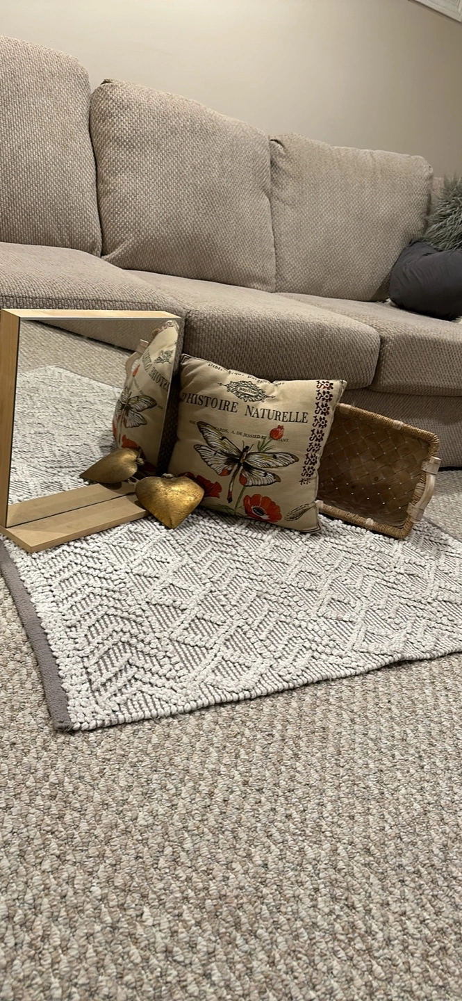 10One heart Made of metal with an antique finish. Mirror that is self standing Area rug size is pictured Decorative dragonfly pillow White wash rectangular basket Price is for all items