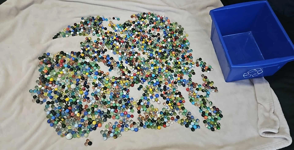 I have a large collection of marbles for sale! There are many different colors and sizes. They come with a blue recycling bin for storage