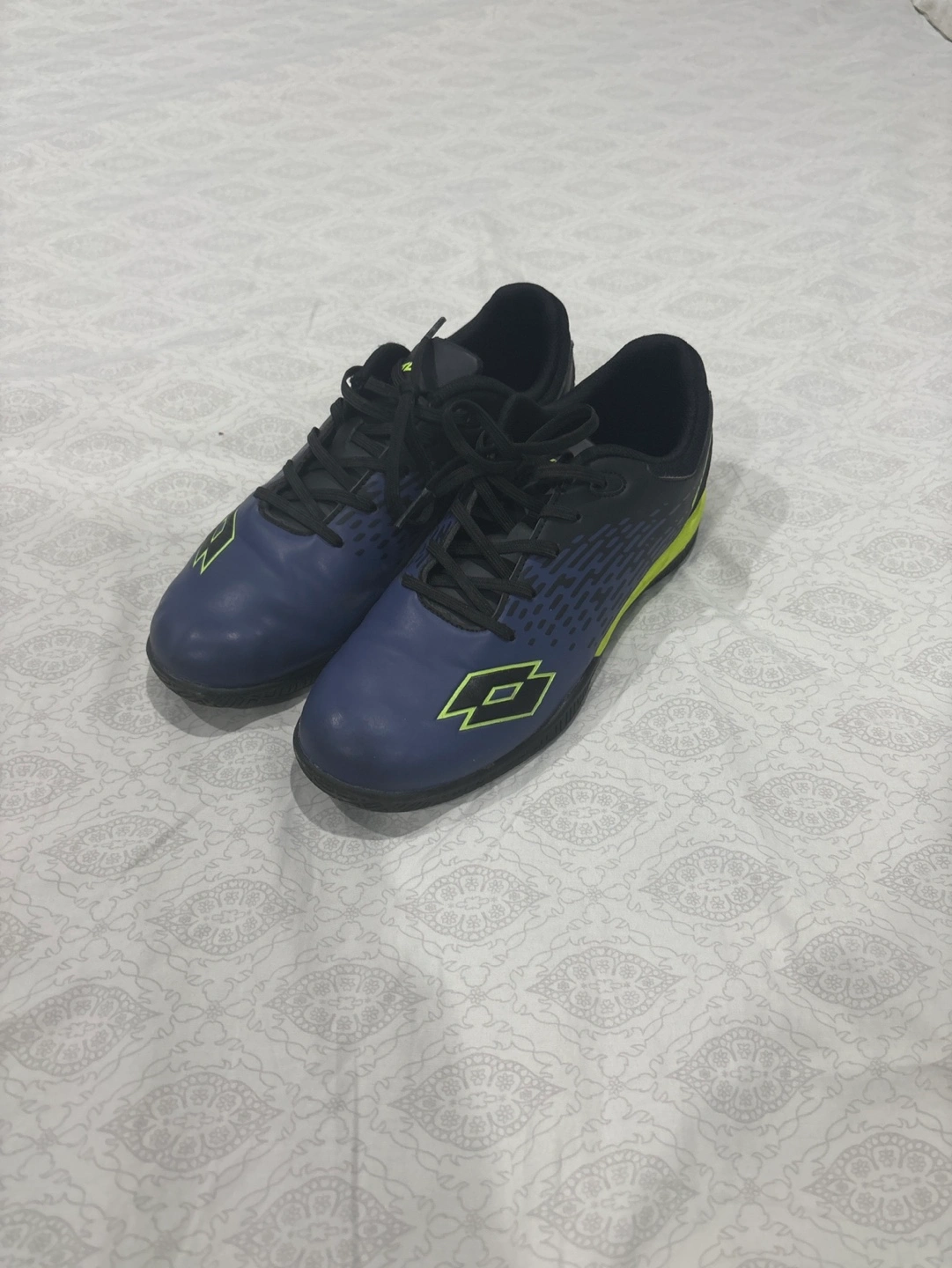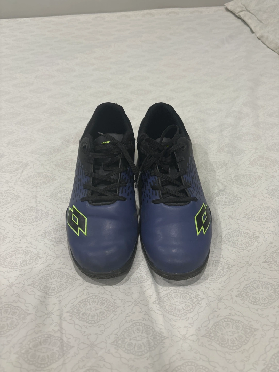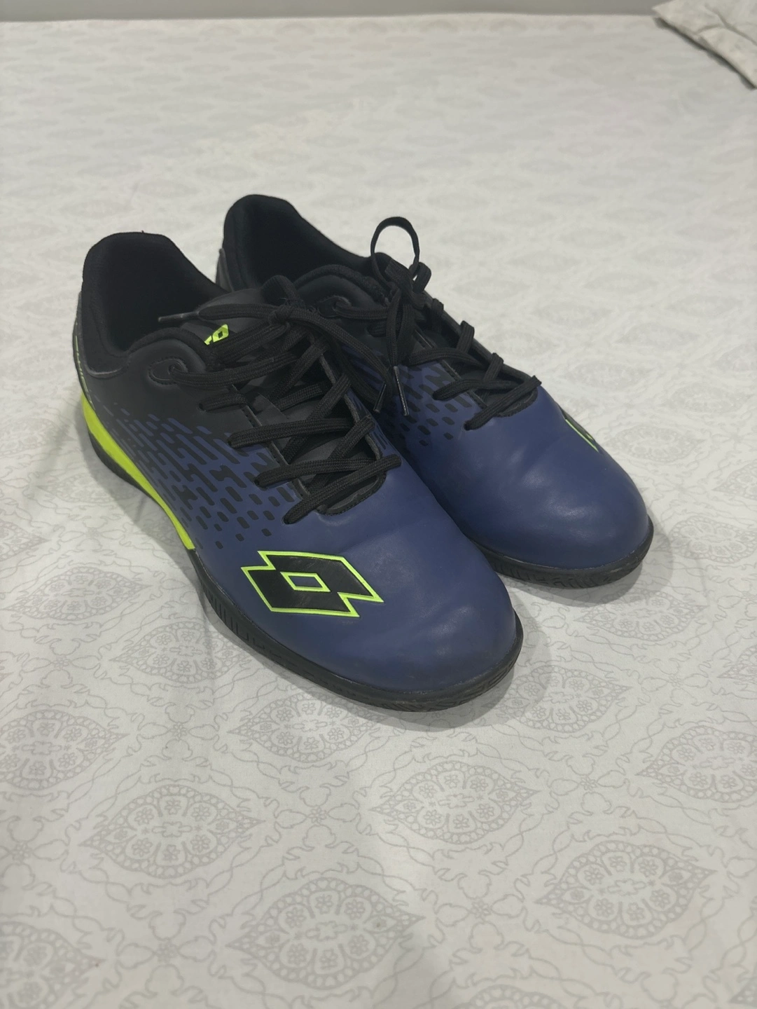 LOTTO indoor soccer shoes. Black and blue with neon green accents. Lace-up.
