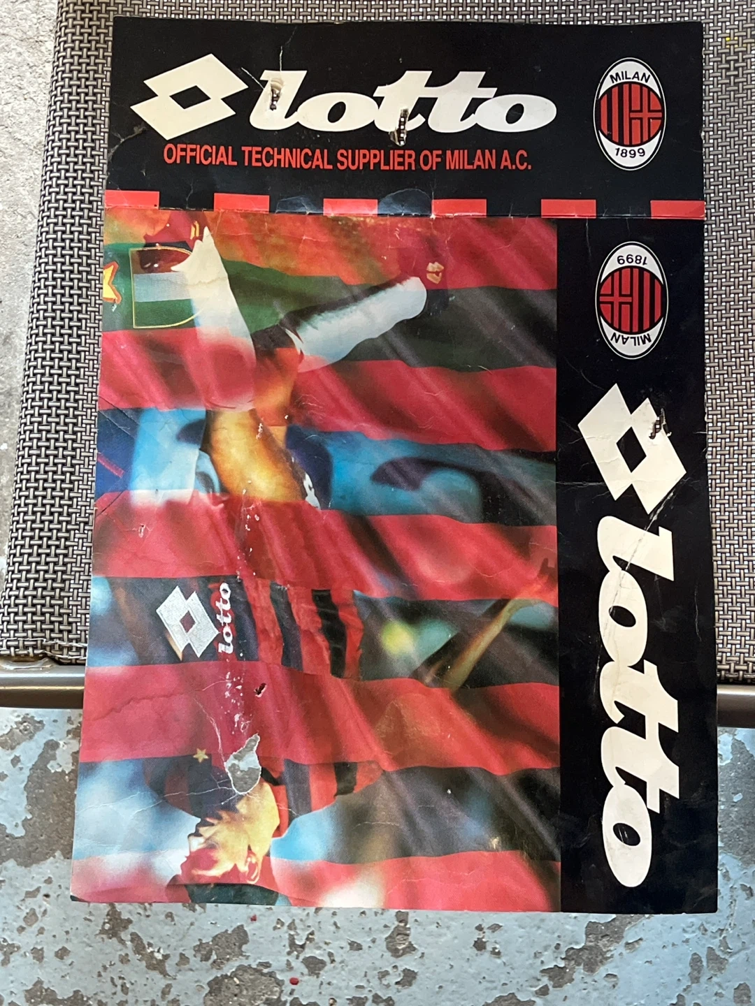 14This is a Lotto official technical supplier of Milan A.C. item. It features the Lotto logo and the Milan A.C. logo from 1899. It appears to be a poster or promotional item.the condition is not that good because the poster itself is 35+ years old it has some holes in it