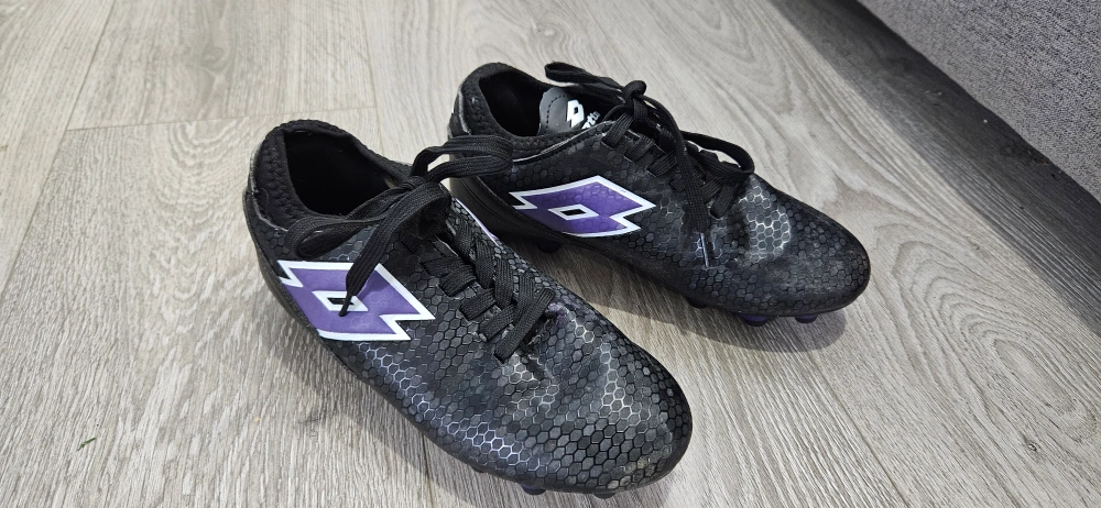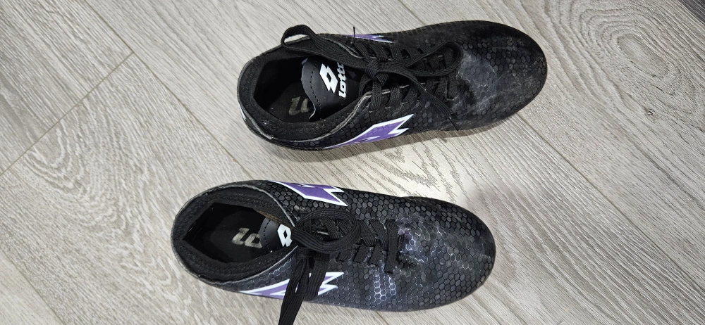 62Size US 4, Eur 36, UK 3.5. These cleats have a black and purple color scheme, and are lace-up. You might use these to have some fun playing soccer. The soles are a vibrant purple color.