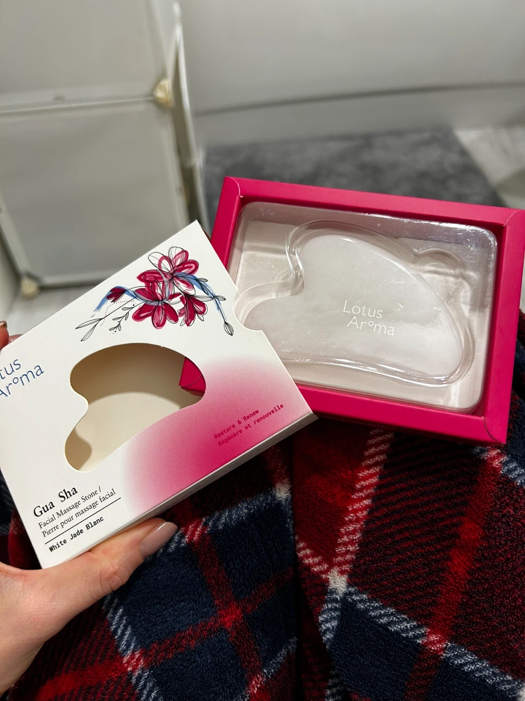 17brand new Lotus Aroma Gua Sha Facial Massage Stone! It's a white jade stone designed to restore and renew your skin. Comes in the original packaging with instructions on how to use it for reducing puffiness and relieving tension. It's perfect for massaging the face and neck to stimulate circulation and release tension