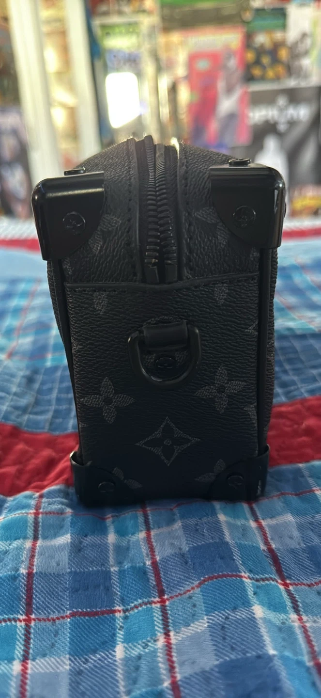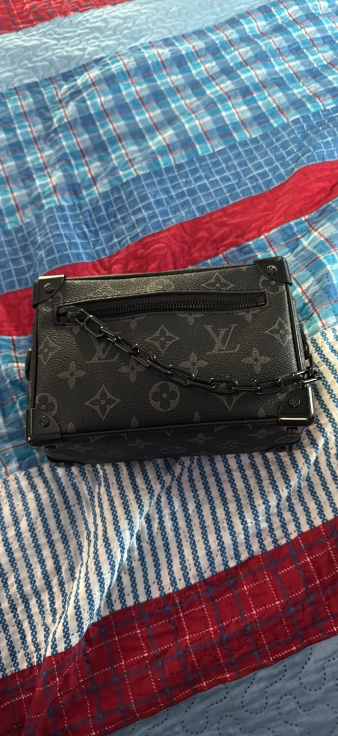 10Selling a stylish Louis Vuitton trunk clutch in black. It's in great condition and ready for a new home! Features the classic LV monogram pattern and a chain detail.