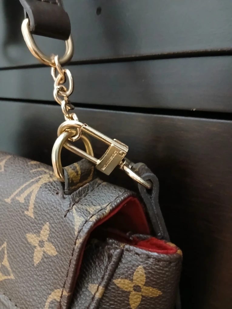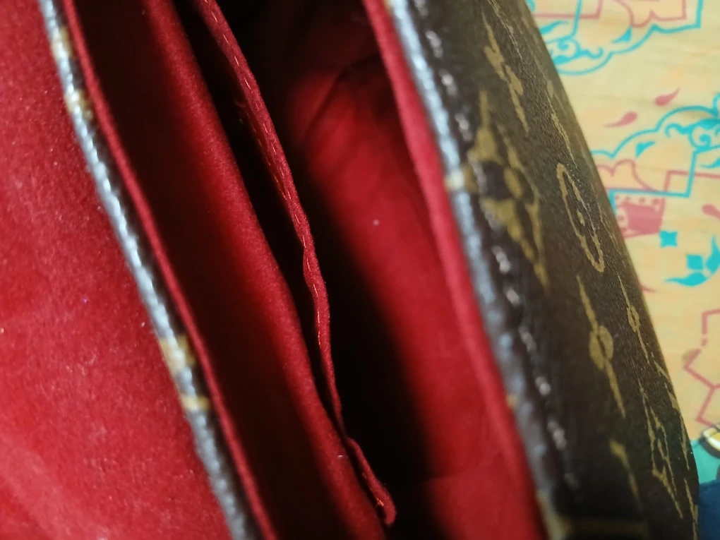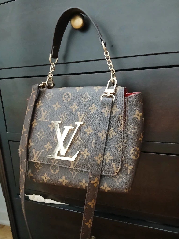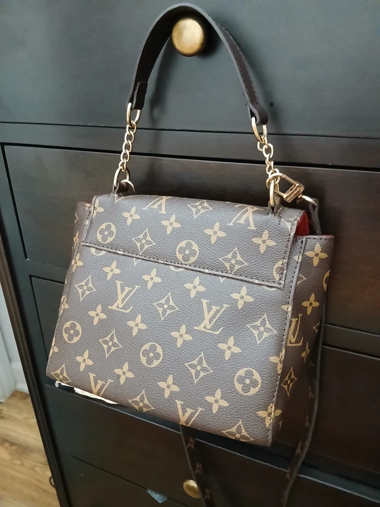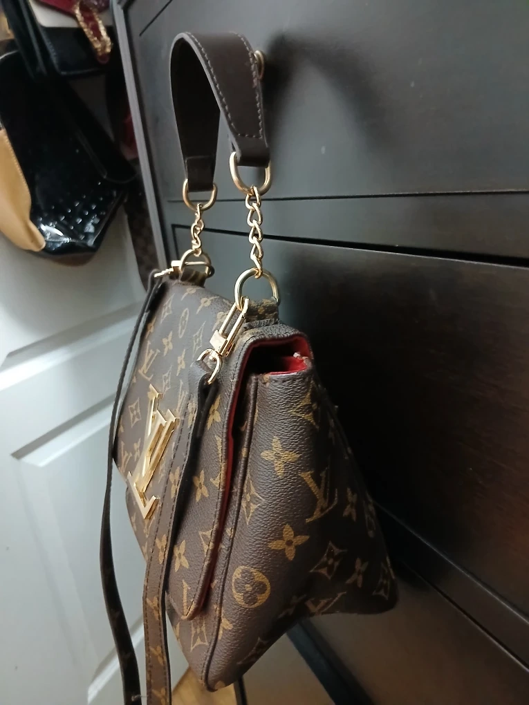25This is a beautiful Louis Vuitton shoulder bag in brown leather. It features a gold chain and a red interior. It's in great condition and ready for a new owner!
