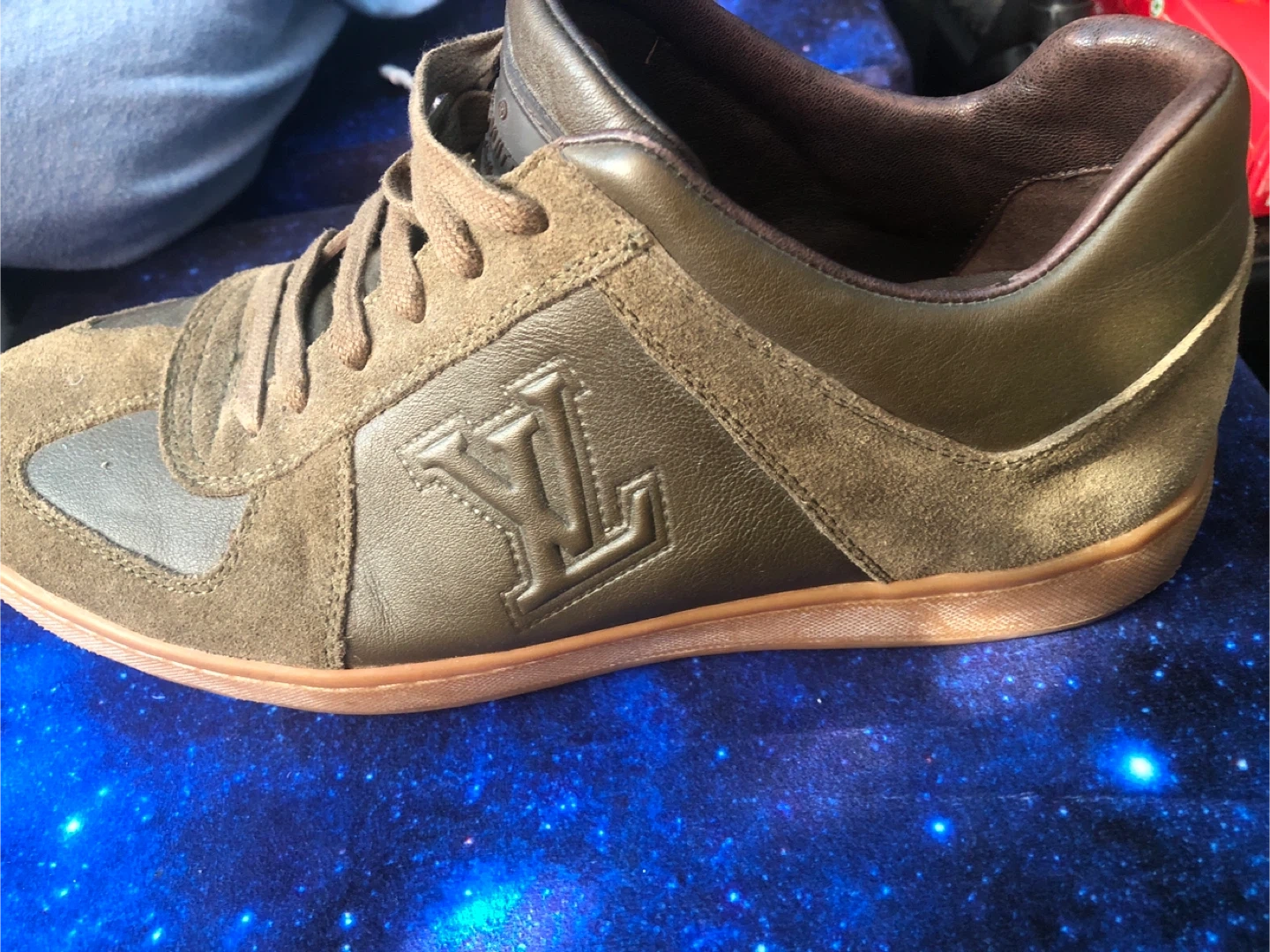 Louis Vuitton brown leather sneakers in good condition. Features the iconic LV logo on the side. Great for casual wear!