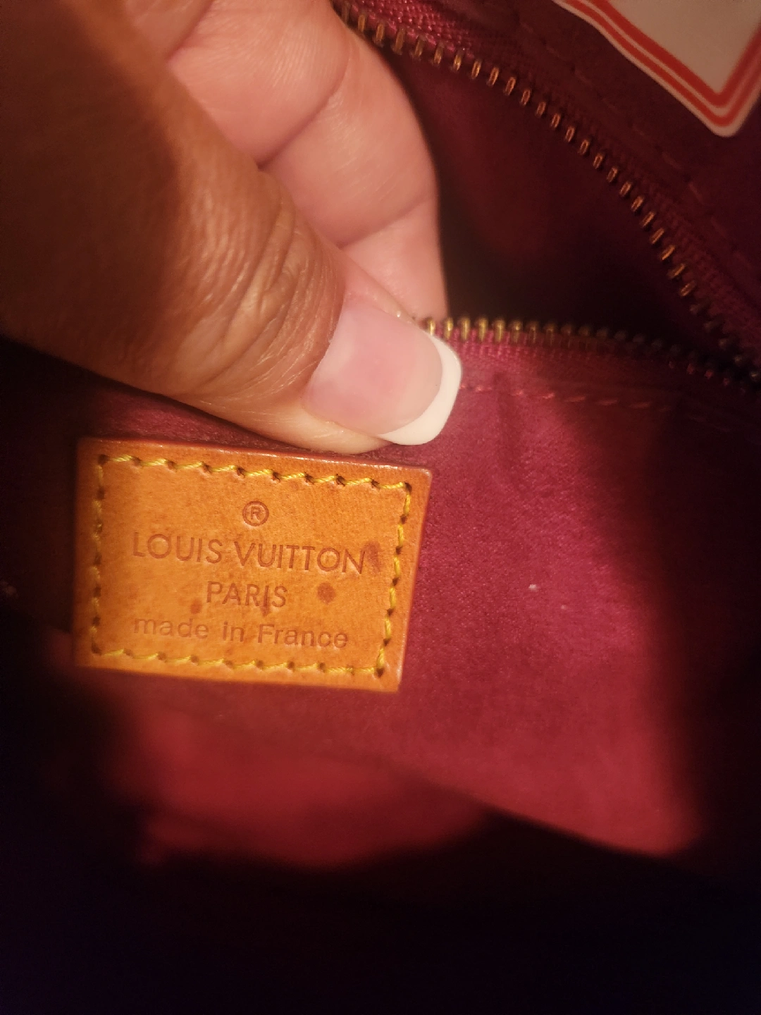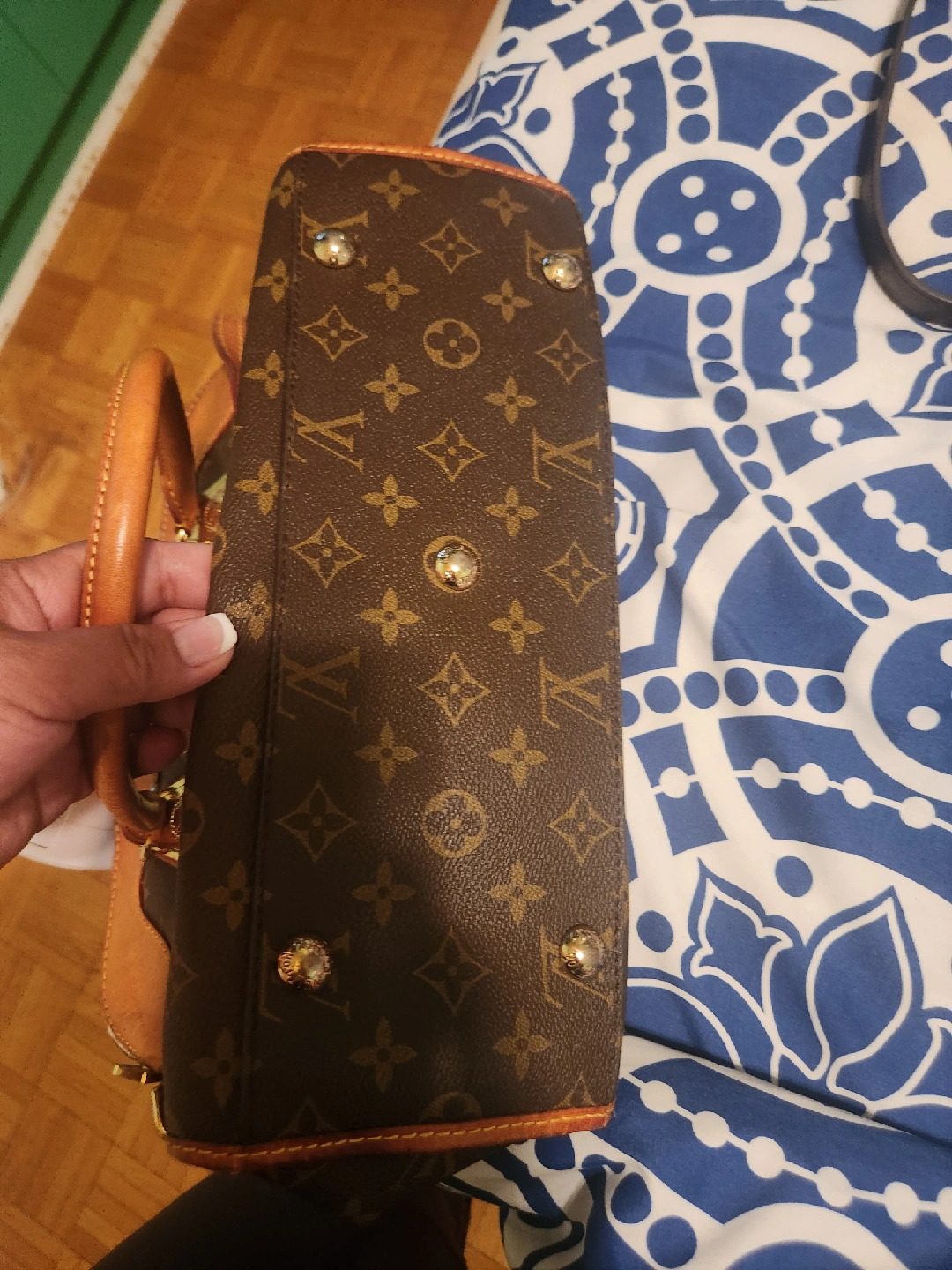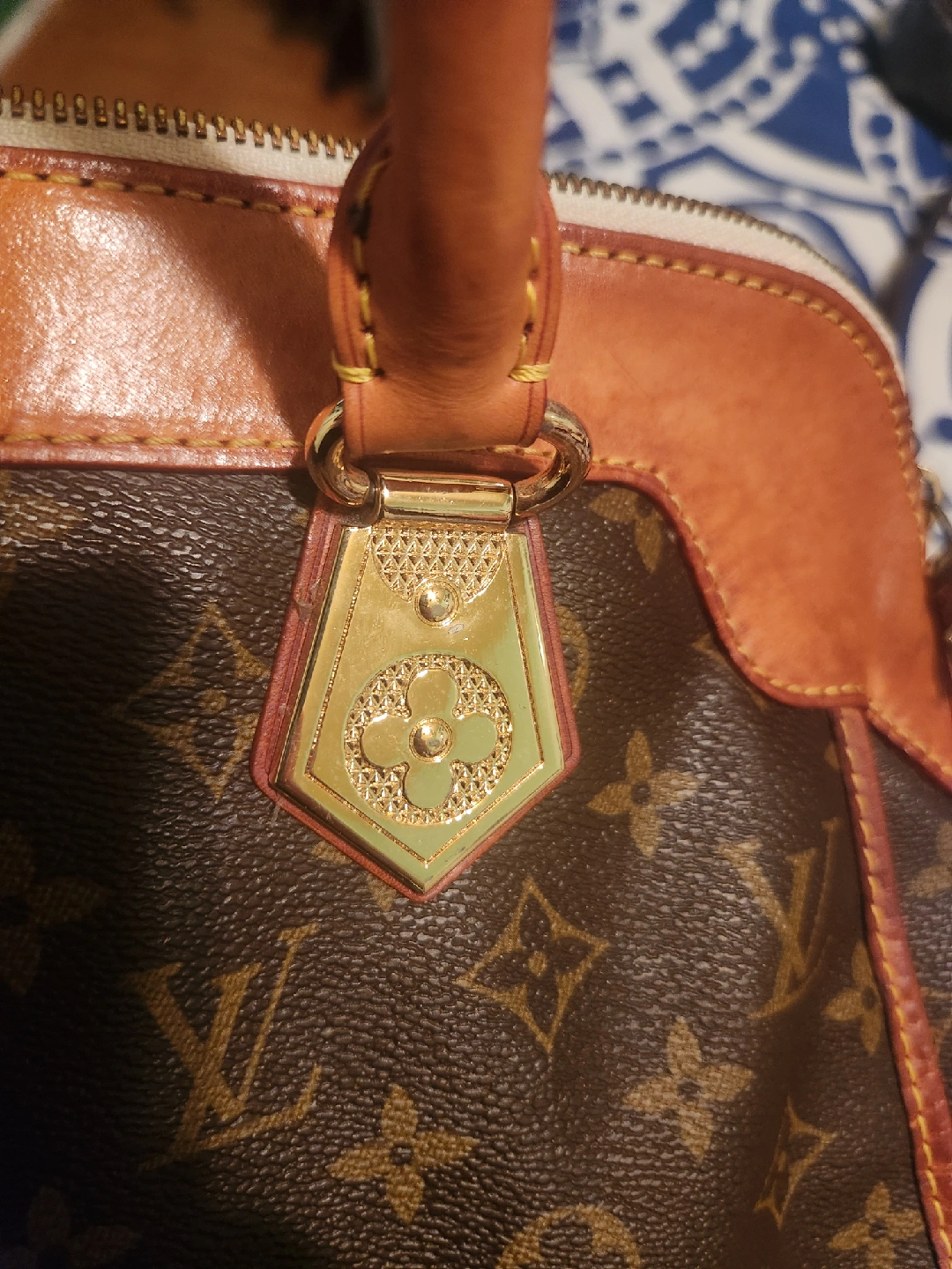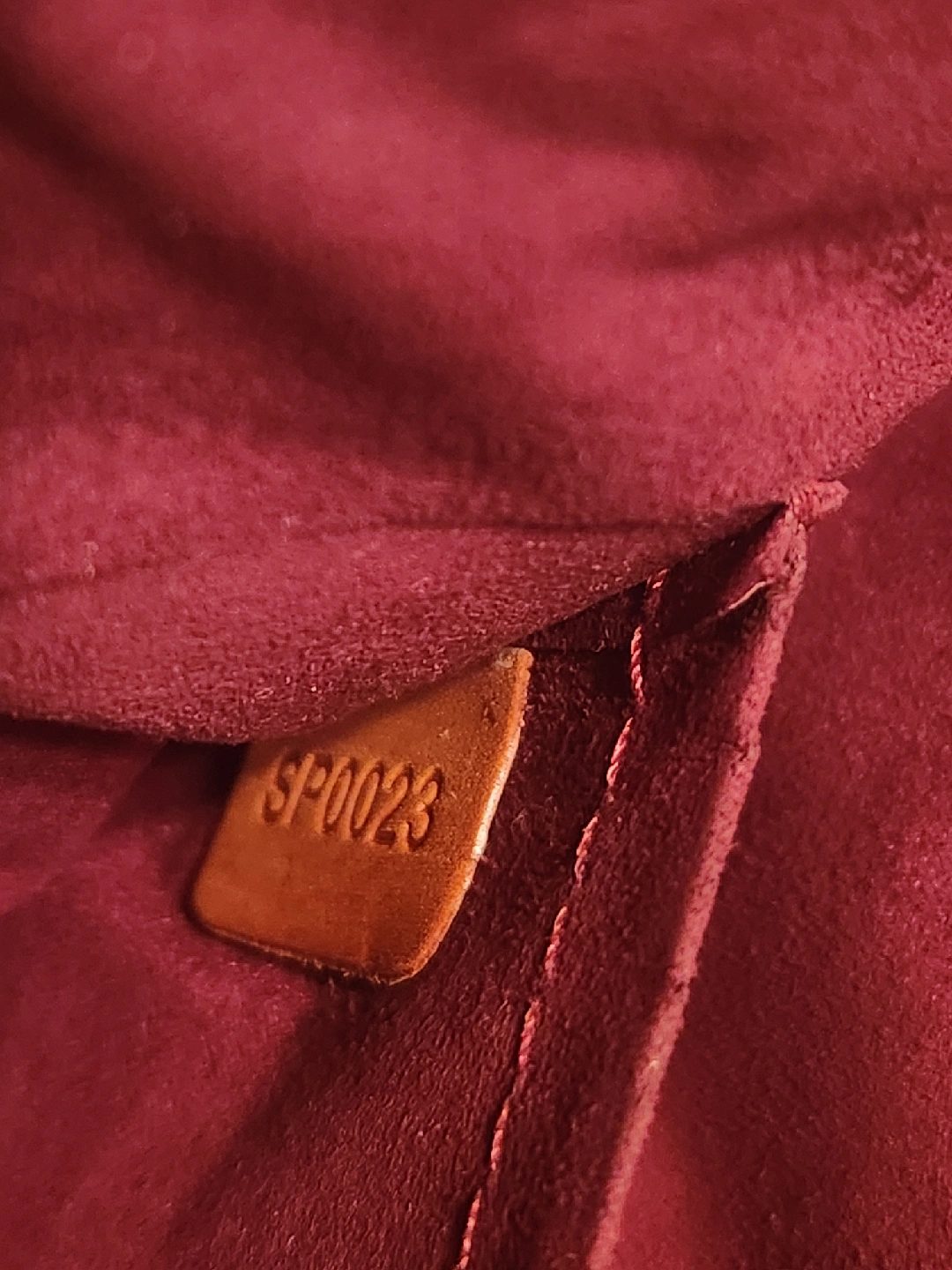 This is a Louis Vuitton handbag featuring the classic brown monogram pattern and leather trim. The interior tag reads "LOUIS VUITTON PARIS made in France" and the interior also has a tag with "SP0023". It's a stylish and recognizable piece!