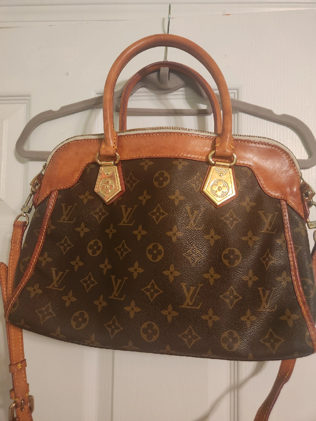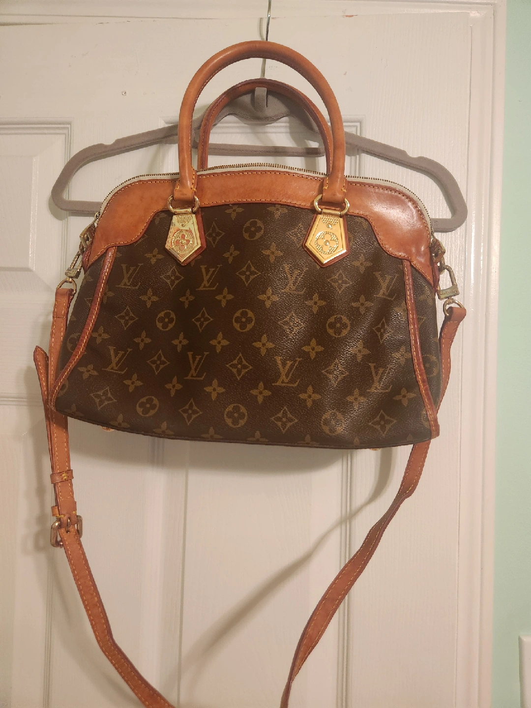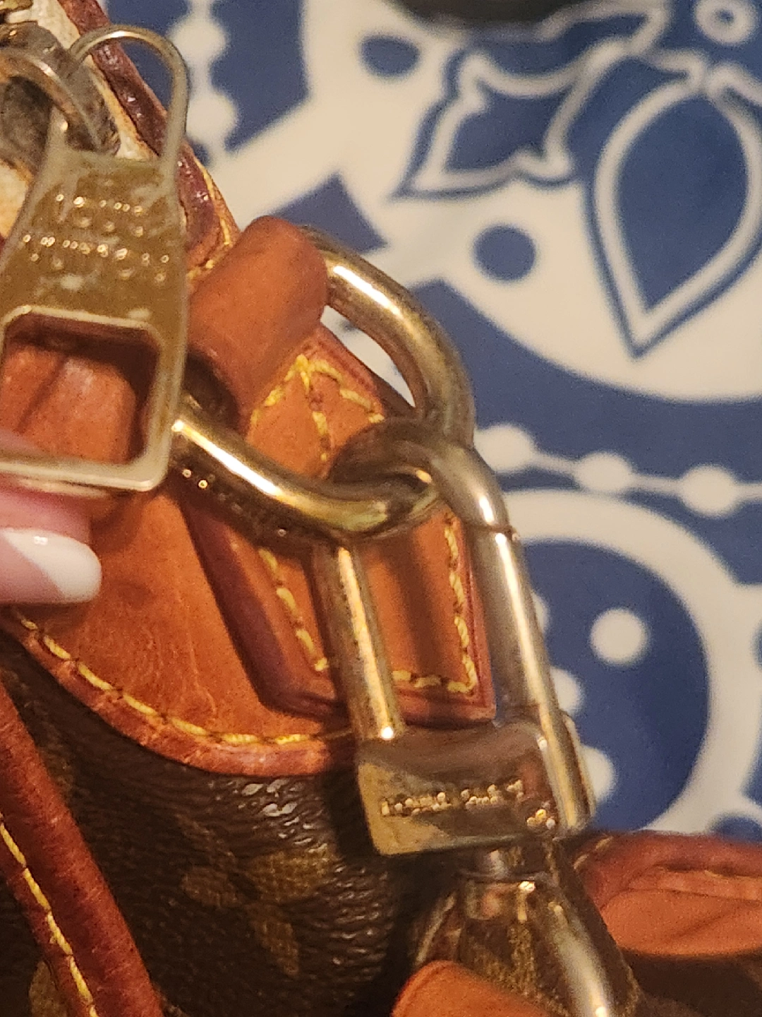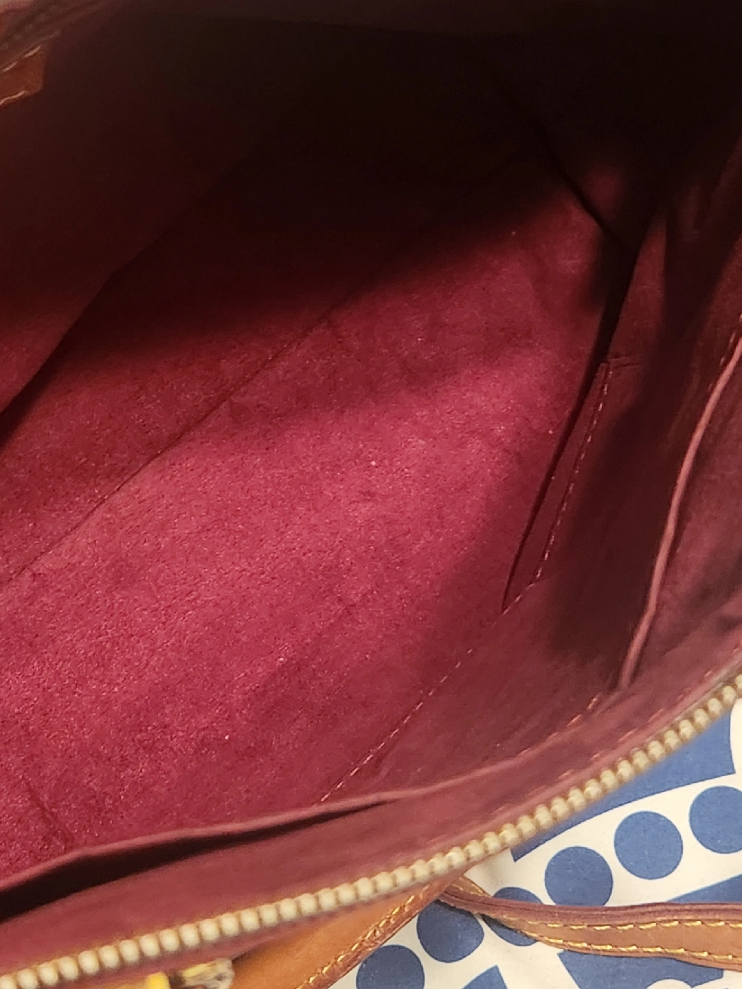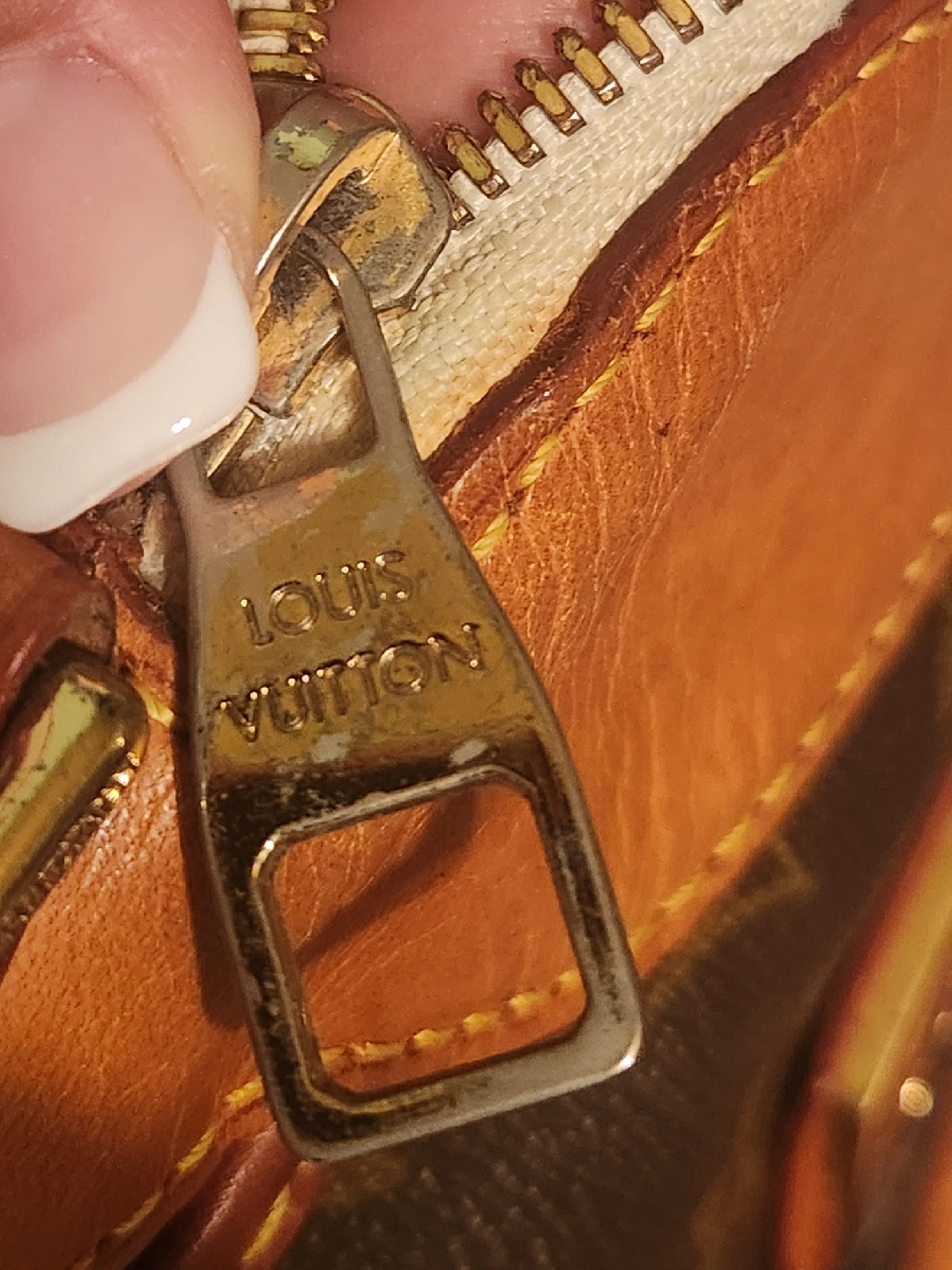 This is a Louis Vuitton handbag featuring the classic brown monogram pattern and leather trim. The interior tag reads "LOUIS VUITTON PARIS made in France" and the interior also has a tag with "SP0023". It's a stylish and recognizable piece!