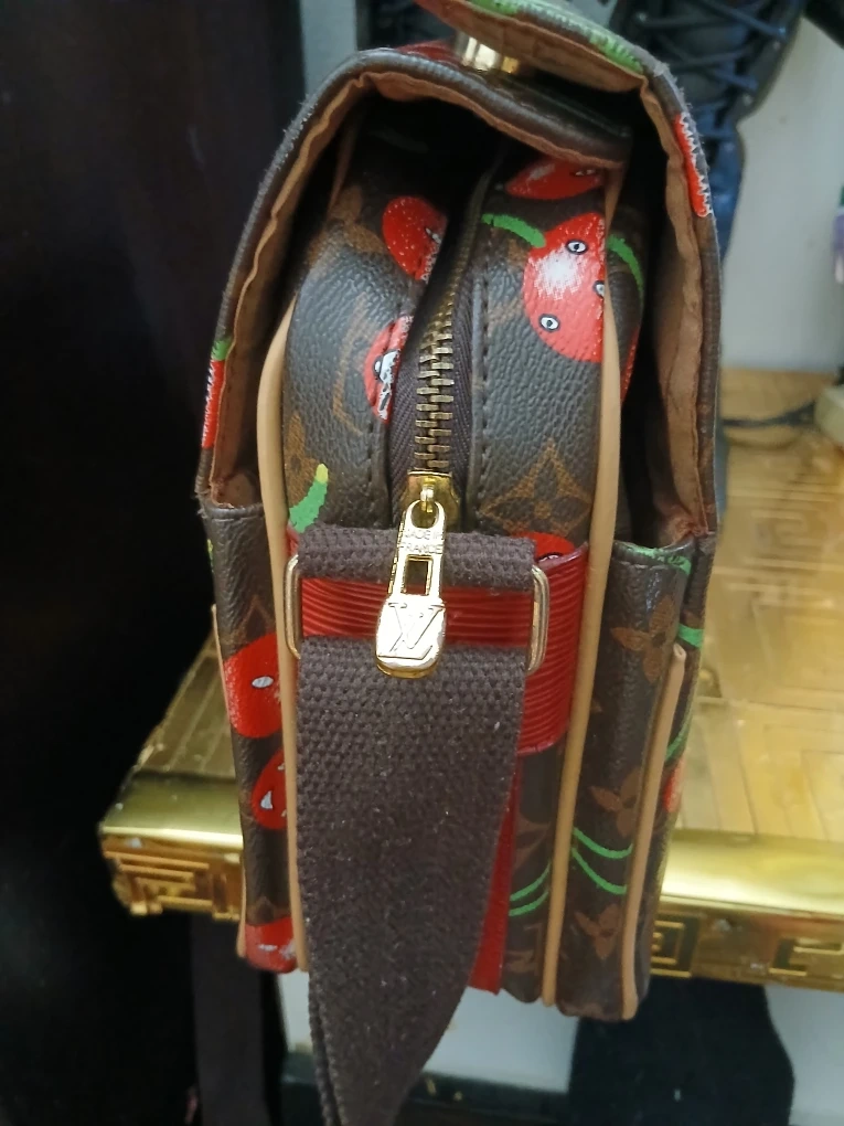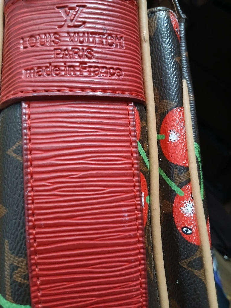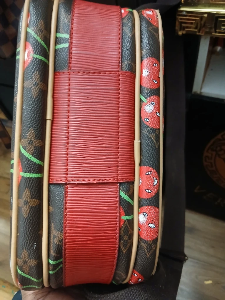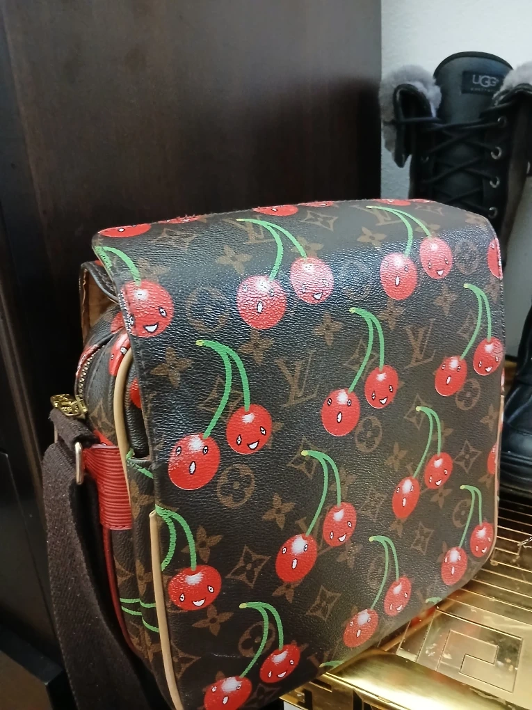 25This Louis Vuitton crossbody bag features a fun cherry print design. It's made in France and has a red strap. The bag is in good condition and ready for a new home!