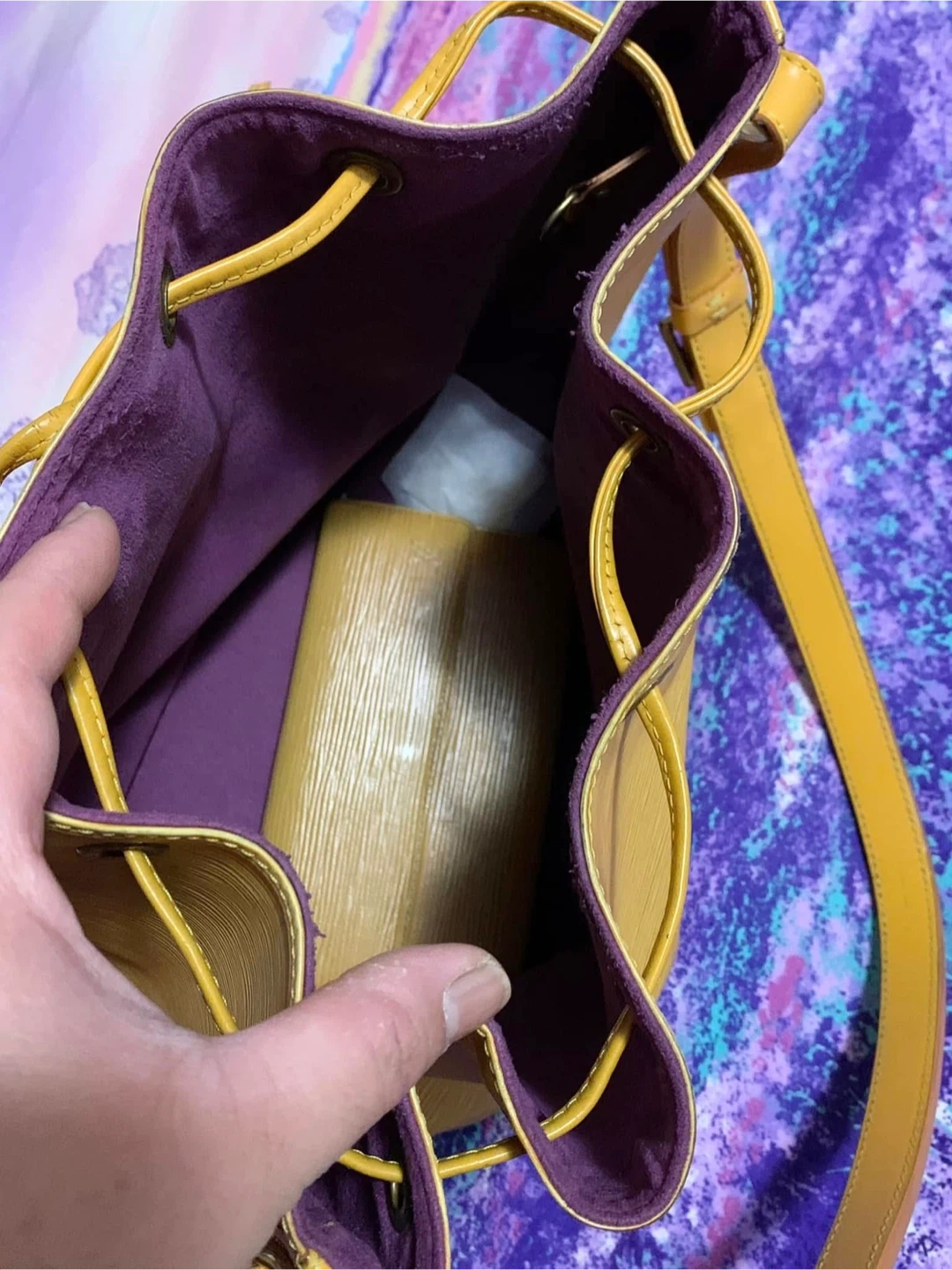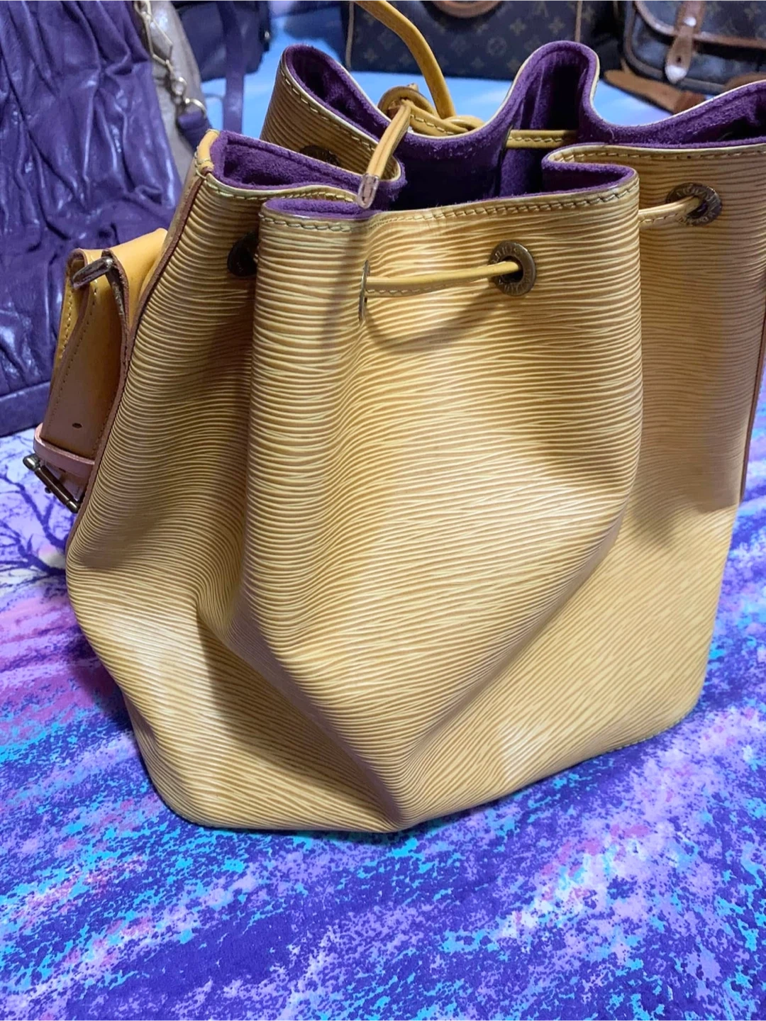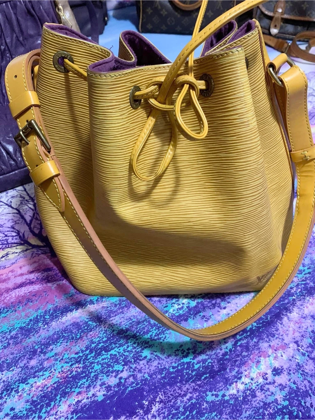 30Selling used Louis Vuitton bucket bag in yellow Epi leather. It's a beautiful bag with a drawstring closure and shoulder strap. There are some signs of wear, as shown in the photos, but it's still in good condition and has lots of life.. Please manage your expectation, there is a slightly faded in the body of the bag.Hardware a bit tarnish. Minimal rubs in the corner, no smell & its clean inside. Purchased in JAPAN. Date code: AR0997 Final Sale No Return No Exchange No Inclusion as well