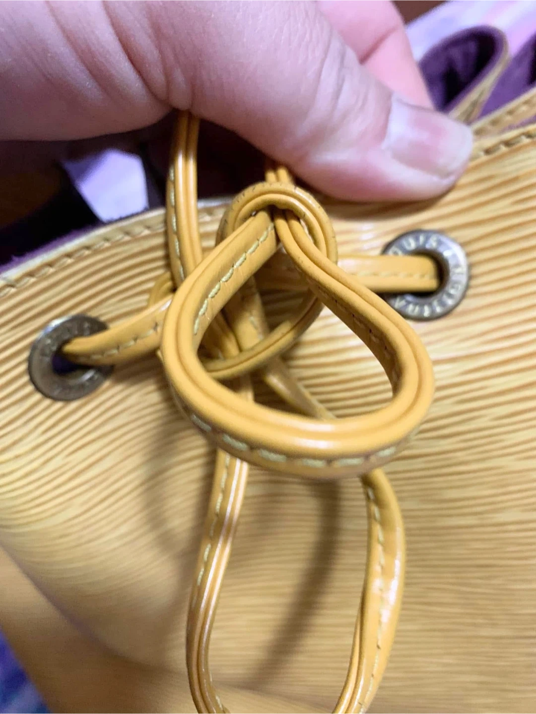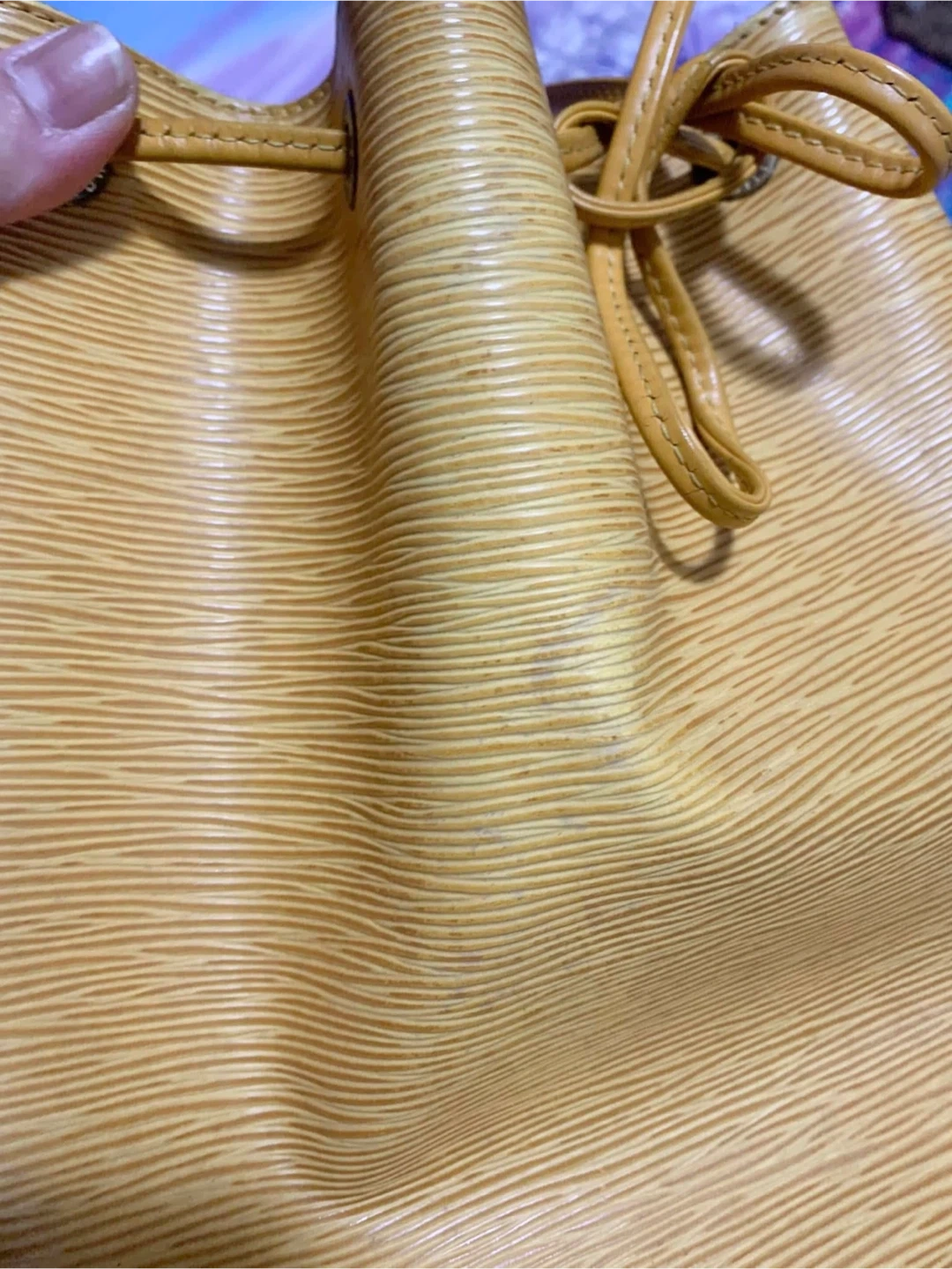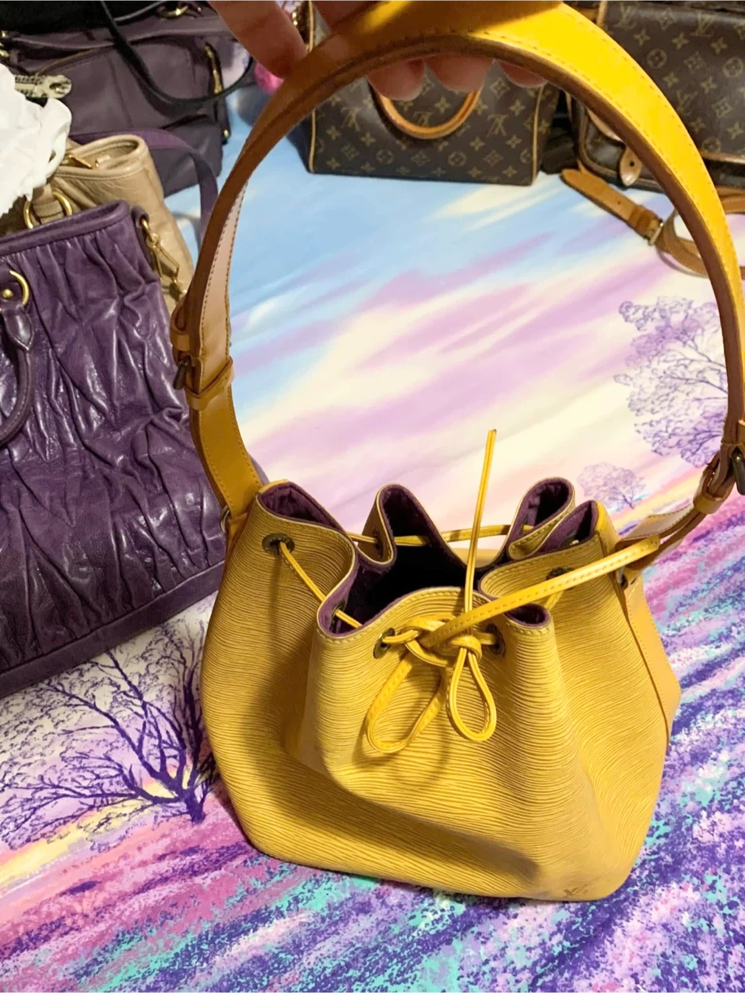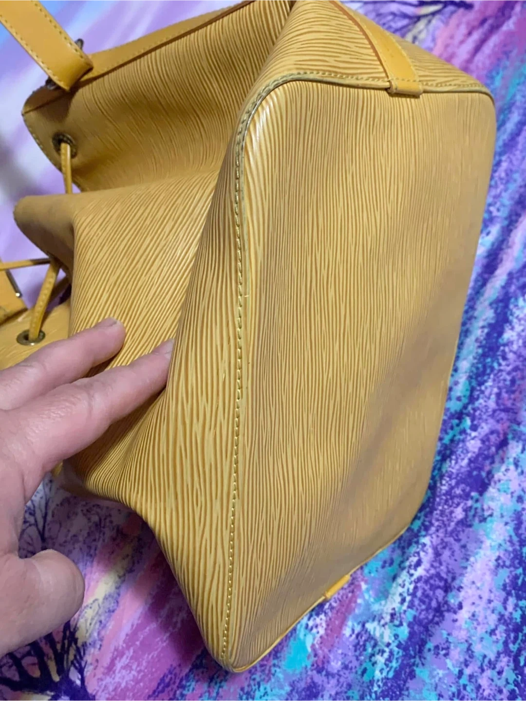 30Selling used Louis Vuitton bucket bag in yellow Epi leather. It's a beautiful bag with a drawstring closure and shoulder strap. There are some signs of wear, as shown in the photos, but it's still in good condition and has lots of life.. Please manage your expectation, there is a slightly faded in the body of the bag.Hardware a bit tarnish. Minimal rubs in the corner, no smell & its clean inside. Purchased in JAPAN. Date code: AR0997 Final Sale No Return No Exchange No Inclusion as well
