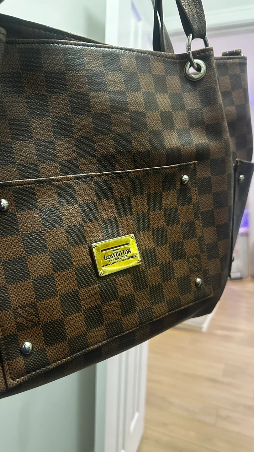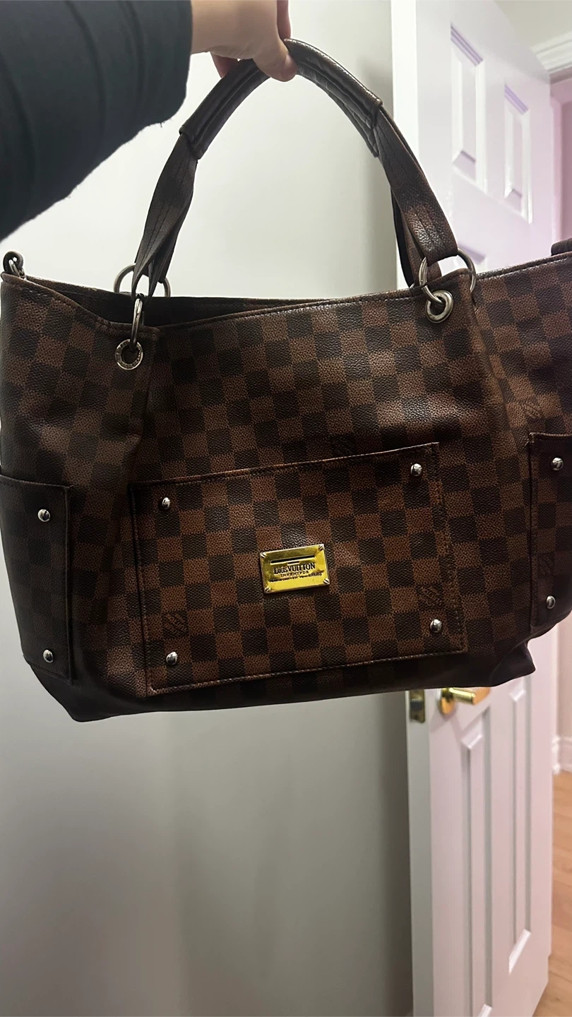 Cute brown checkered tote bag with silver hardware! It's in great condition and perfect for everyday use. The material is durable and the size is ideal for carrying all your essentials. Feel free to ask any questions!