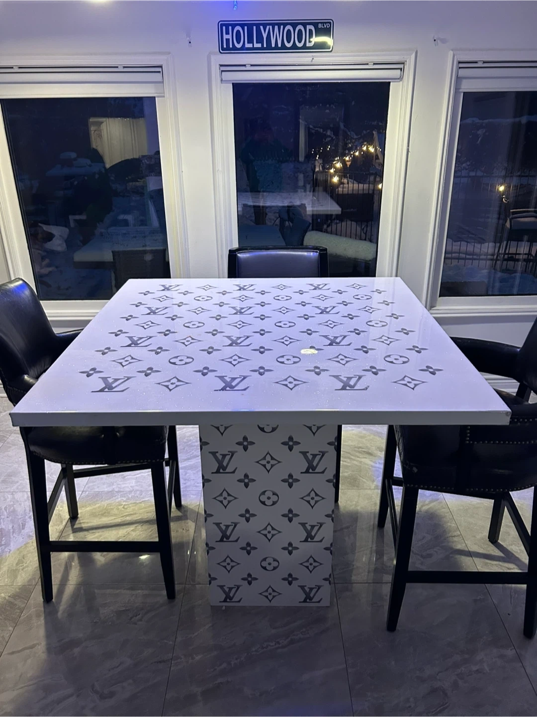 60Selling a custom-made dining table with a Louis Vuitton-inspired design! The table features the iconic LV monogram pattern on the tabletop and the pedestal base. It's a unique piece that would add a touch of luxury to any dining space best offer