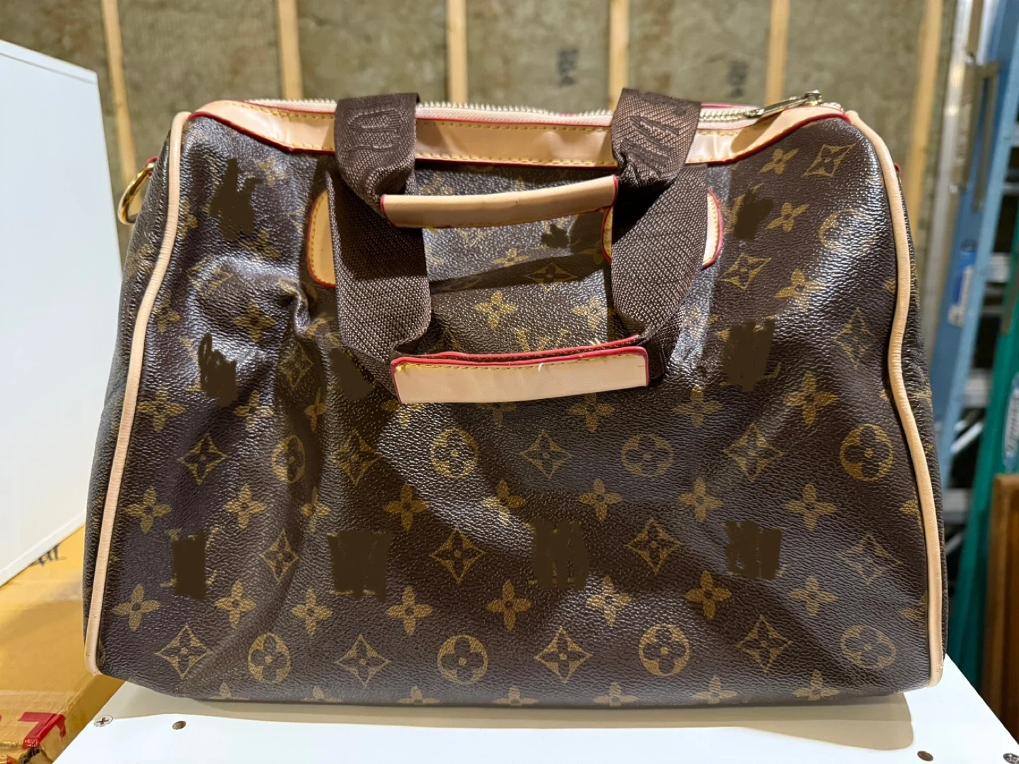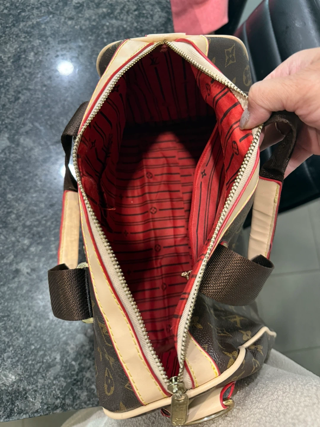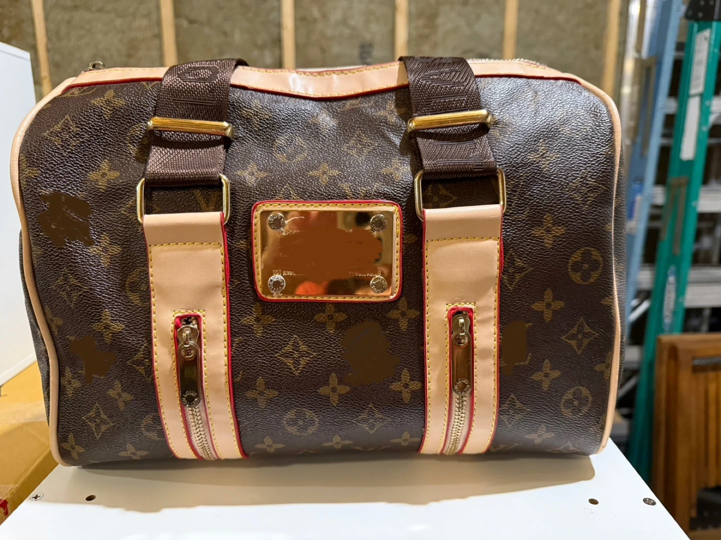 Stylish small duffle bag with a classic design. Features brown and tan accents, along with red trim and a red striped interior. Perfect for travel or everyday use!