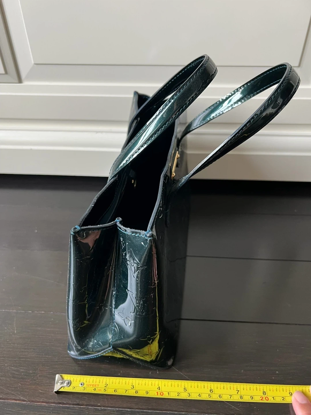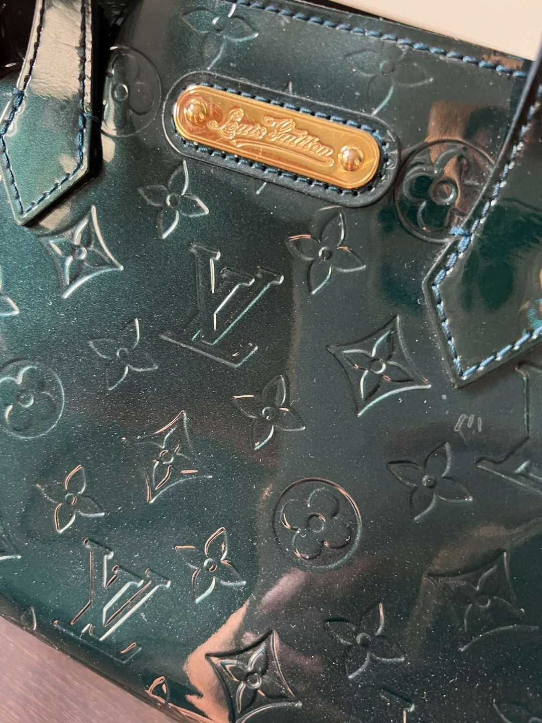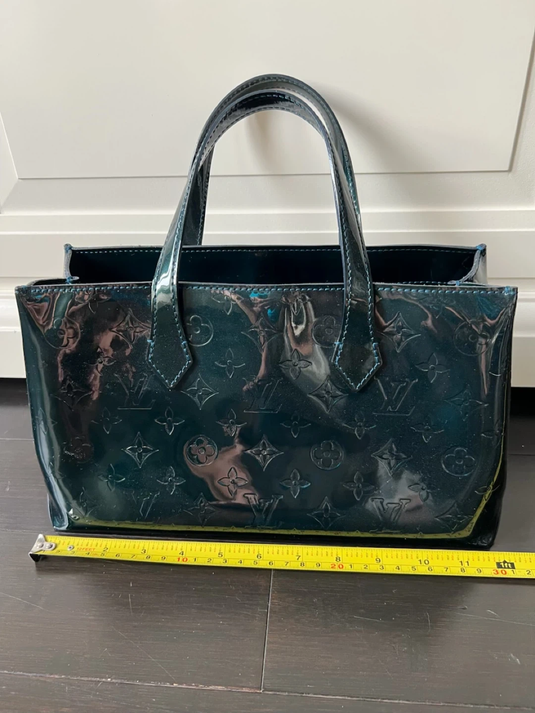 14LOUIS VUITTON Monogram Vernis Wilshire PM Blue green Handle Drop: 4.25" Height: 6.5" Width: 11.5" Depth: 4.75"
