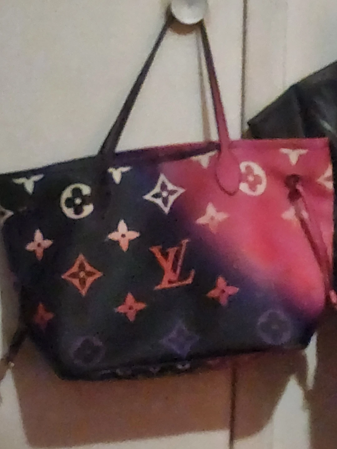 60Selling a Louis Vuitton Neverfull tote bag! It features the classic LV monogram design in a unique colour gradient, transitioning from black/purple to pink. A stylish and eye-catching piece!