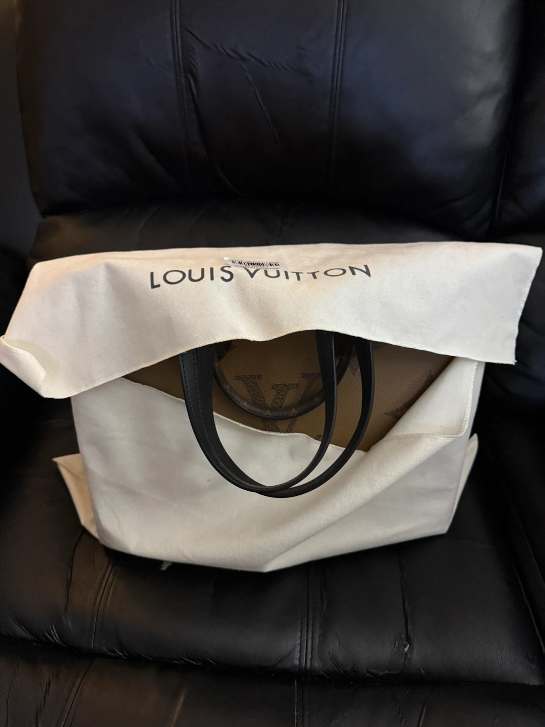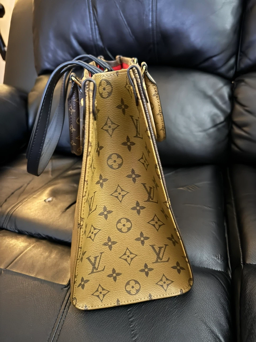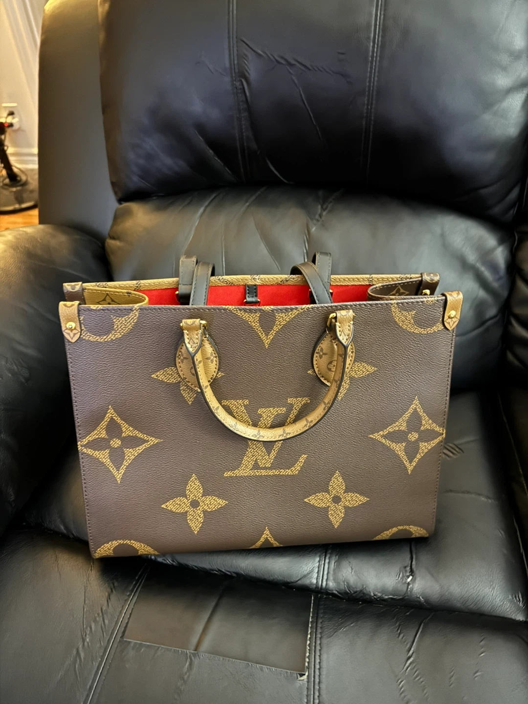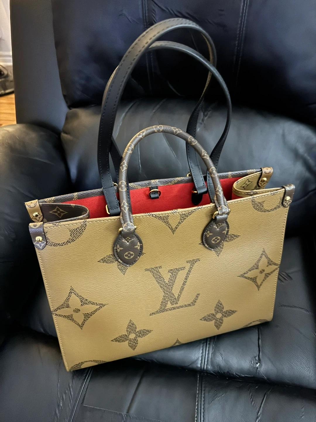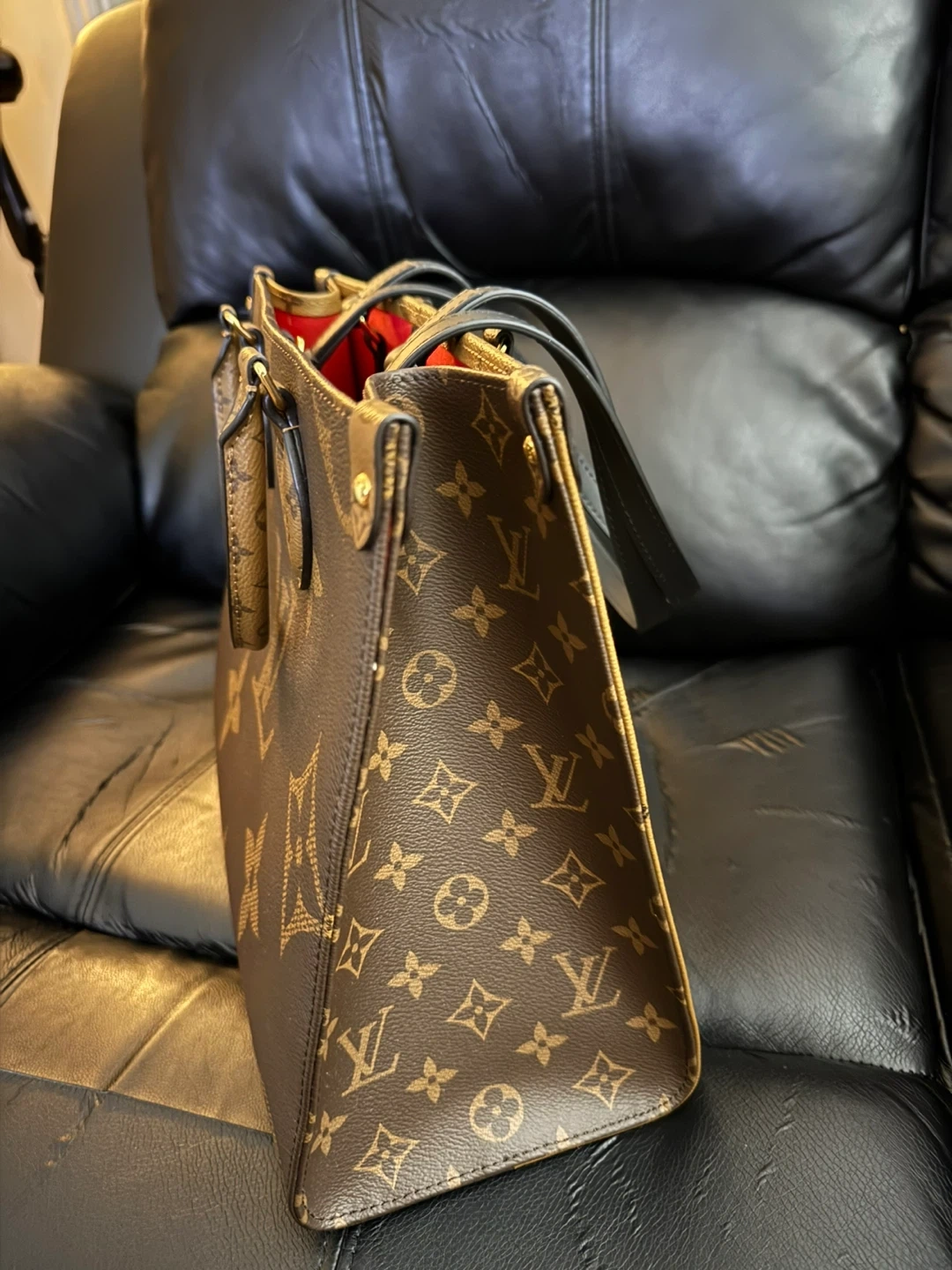 100Selling a Louis Vuitton OnTheGo MM tote bag. It features the iconic LV monogram print and a vibrant red interior. It's in new condition and ready for a new home! Brand new, comes with dust bag.