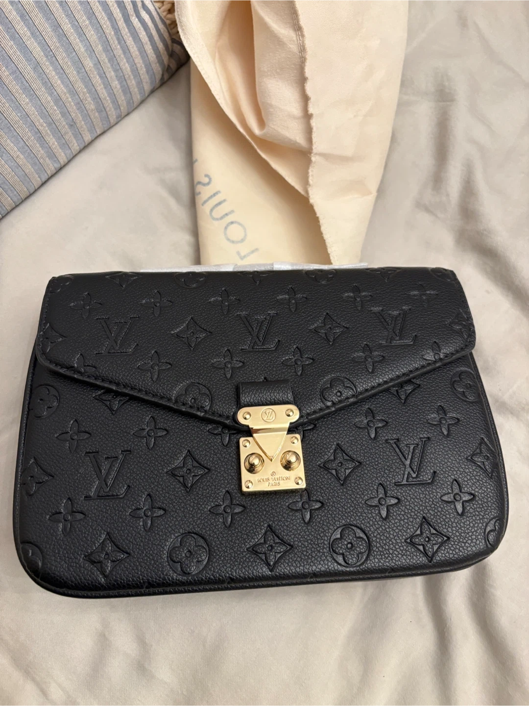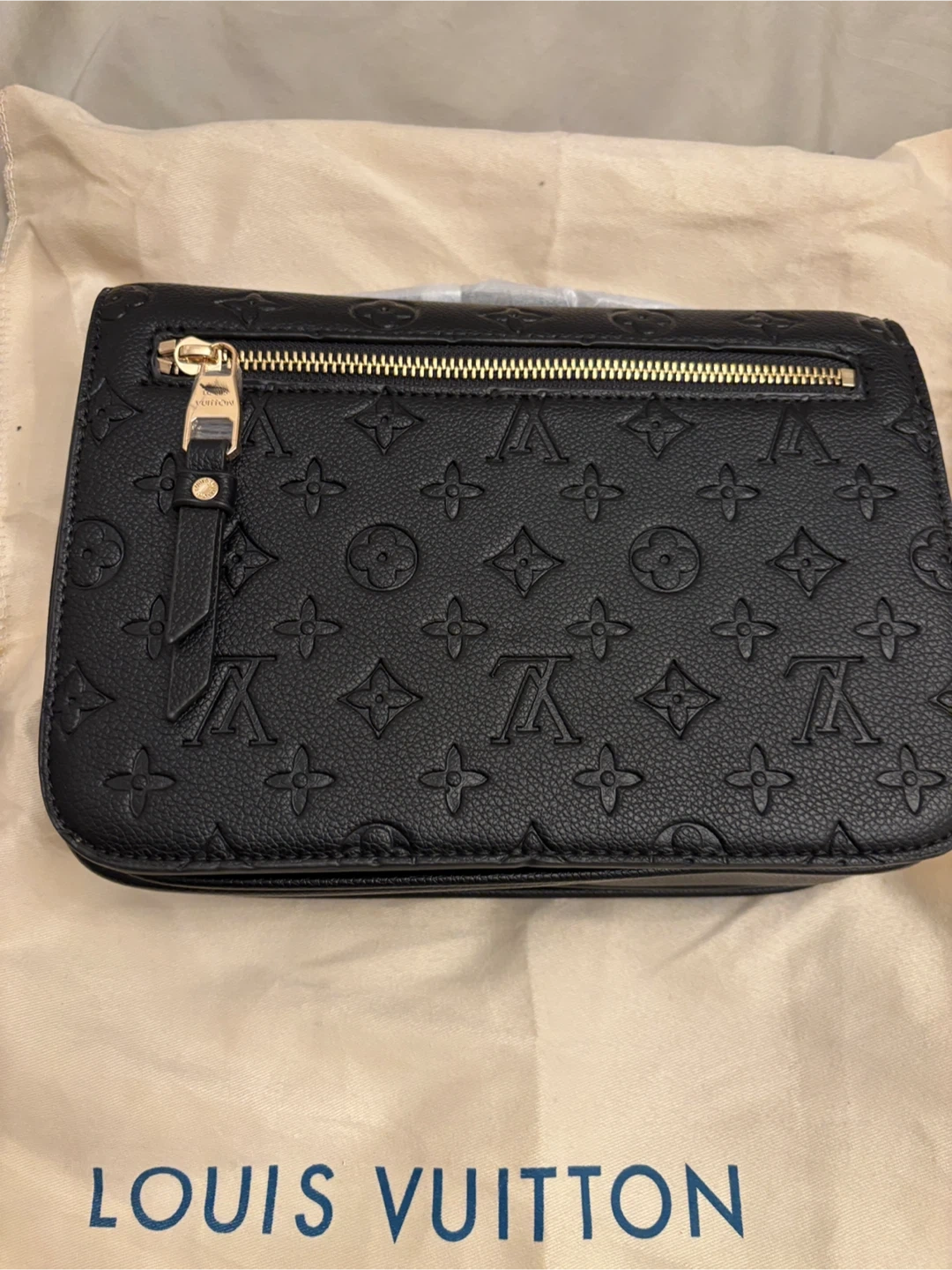 533Selling a beautiful Louis Vuitton Pochette Métis East West bag in black. It's in great condition and comes with the original dust bag. The iconic LV monogram is embossed throughout the leather. A stylish and timeless piece!