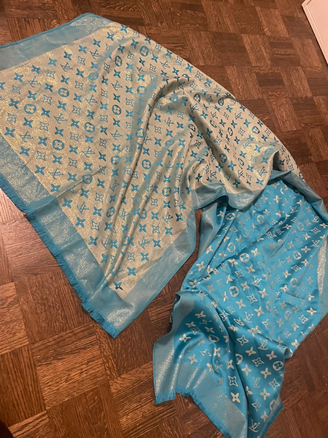 20A beautiful Louis Vuitton shawl in turquoise! The iconic LV pattern is woven throughout the soft material. It's a stylish and versatile accessory to add a touch of luxury to your wardrobe