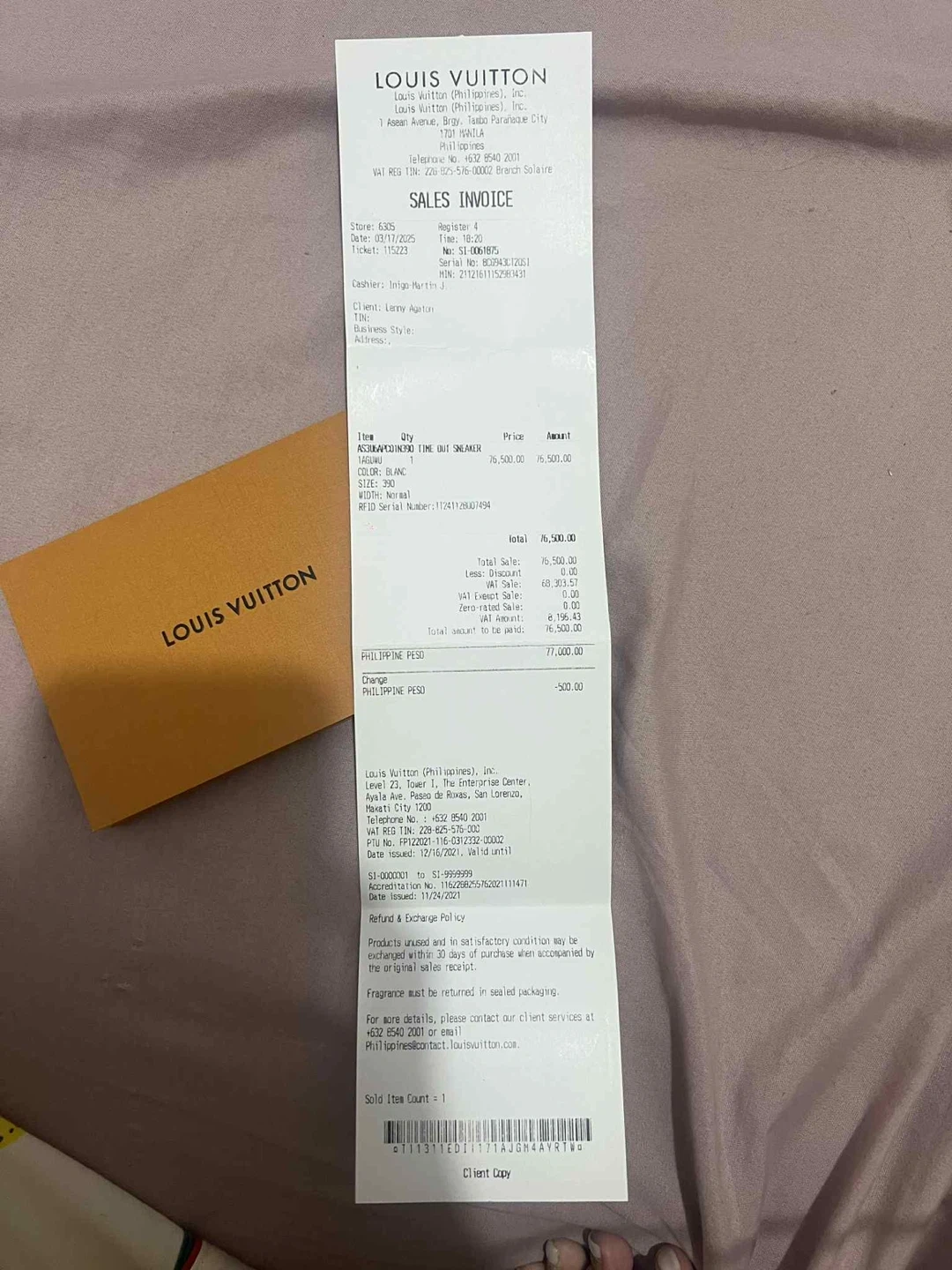 10Selling a pair of Louis Vuitton Time Out sneakers in size 39. They are in great condition and come with the original box. The sneakers are white with the LV logo subtly embossed on the side. Originally bought for 76,500.00 Philippine pesos or 1,900 Cad negotiable.. 100% brand new .