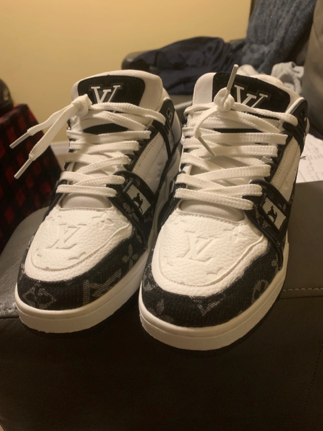 10Selling a pair of Louis Vuitton Trainer sneakers! They feature a white and black monogram design. The soles have the Louis Vuitton logo. Great for adding a touch of luxury to your everyday style