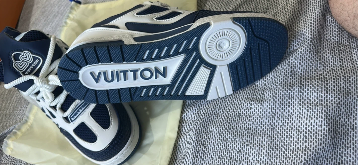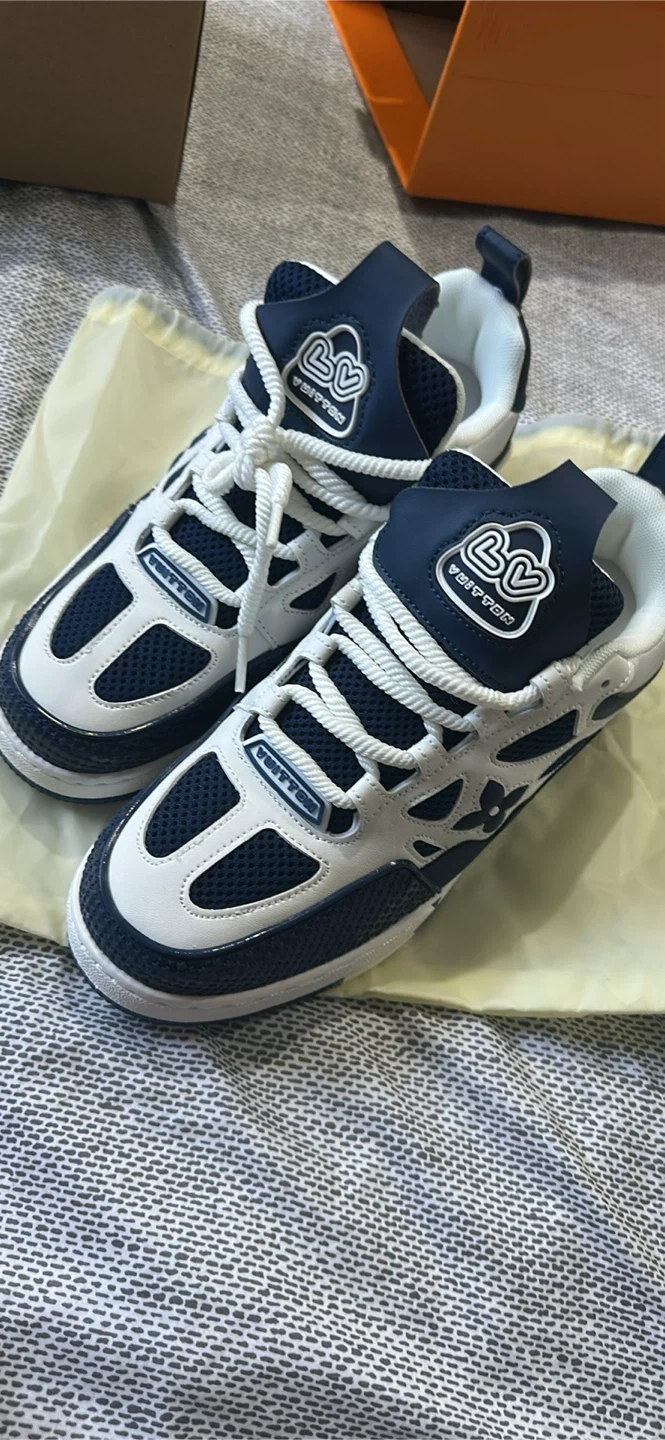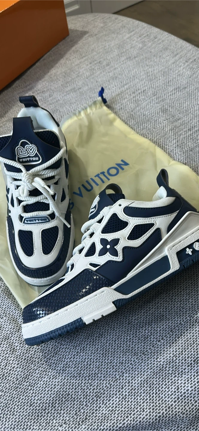 10Selling a pair of Louis Vuitton Trainer sneakers in navy and white. These stylish sneakers feature the iconic LV logo and are in great condition. Perfect for adding a touch of luxury to your everyday look! SIZE (41,43)