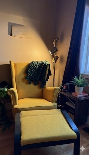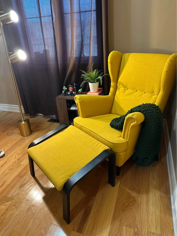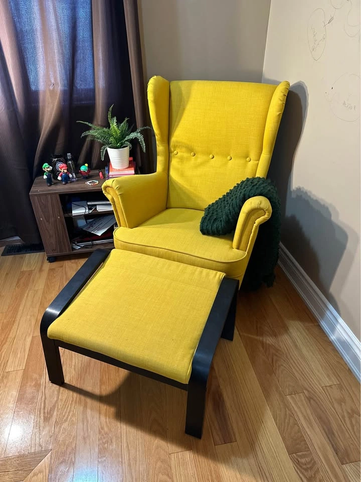 60Like new, rarely used Ikea arm chair and footstool set. Price at Ikea is over $500. Selling a meticulously maintained three (or four!) piece set that works beautifully together. What's Included: IKEA STRANDMON Armchair and footstool, Skiftebo yellow Accent Chair: A classic silhouette upholstered in a bright, textured yellow fabric. This chair features a high back, rolled arms, and tufting, making it a perfect statement piece for your living room, bedroom, or office. Excellent condition! Matching Yellow Ottoman/Footstool (Bonus Item!): Included with the chair, this matching footstool allows you to truly relax and put your feet up. It’s an essential part of the comfort package. (Note: This appears to be an IKEA POÄNG-style ottoman frame, but confirm the model if possible!) Mid-Century Modern Triple-Head Floor Lamp: A sleek, brass/gold-tone standing lamp with three adjustable cylindrical heads. Provides excellent, focused light for reading or general ambient lighting. A stylish nod to classic modern design! Compact Wooden Side Table/Storage Shelf: A versatile, dark-wood (appears to be a walnut or dark oak finish) table perfect for holding a book, cup of coffee, or remote. It features open shelving underneath for extra storage or displaying decor.