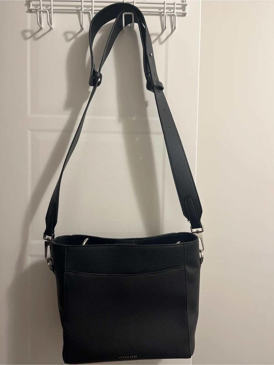 60This is a Love & Lore black crossbody bag in great condition! It's a stylish and versatile bag that's perfect for everyday use. The bag is made of high-quality materials and features a spacious interior with multiple pockets. It has an adjustable shoulder strap for comfortable carrying