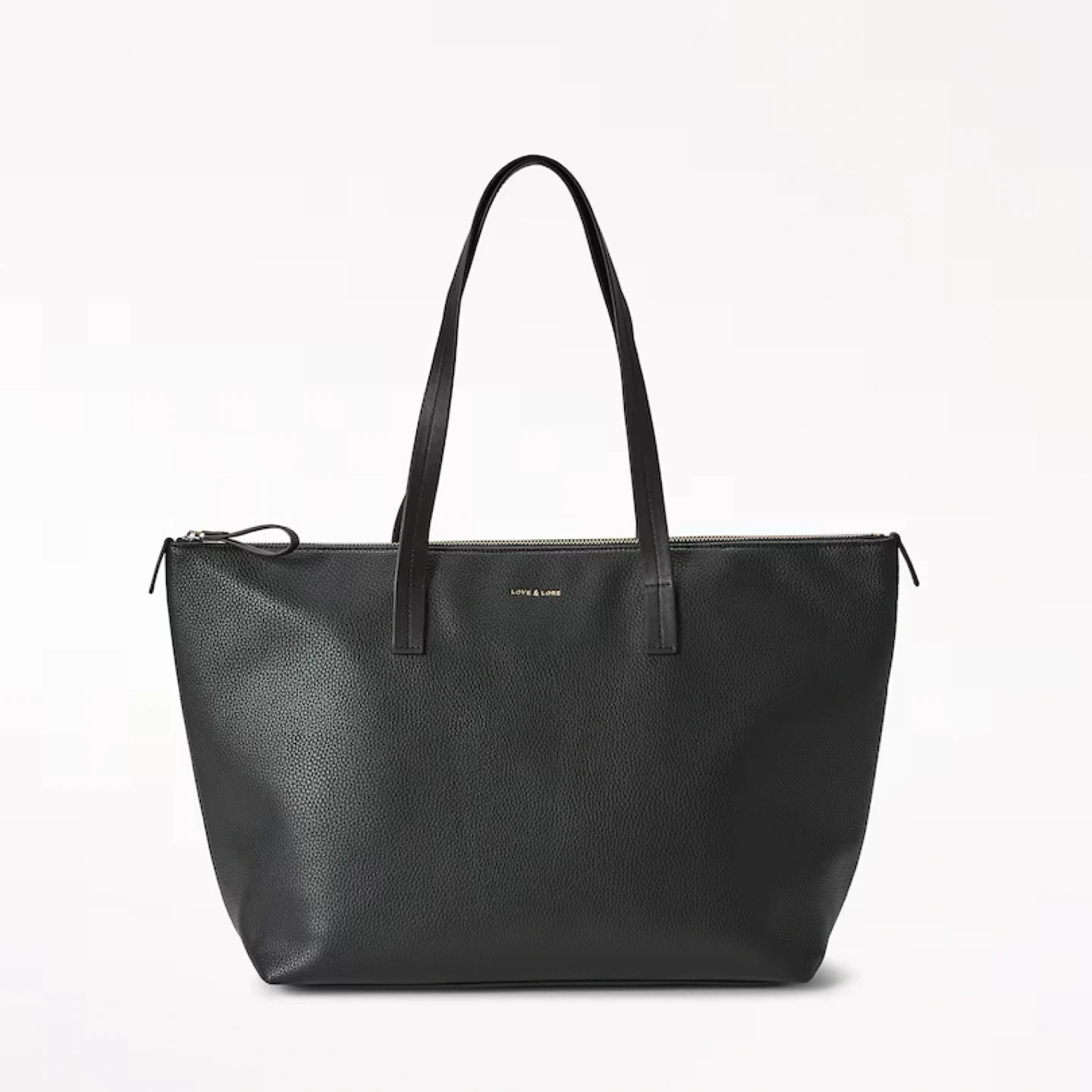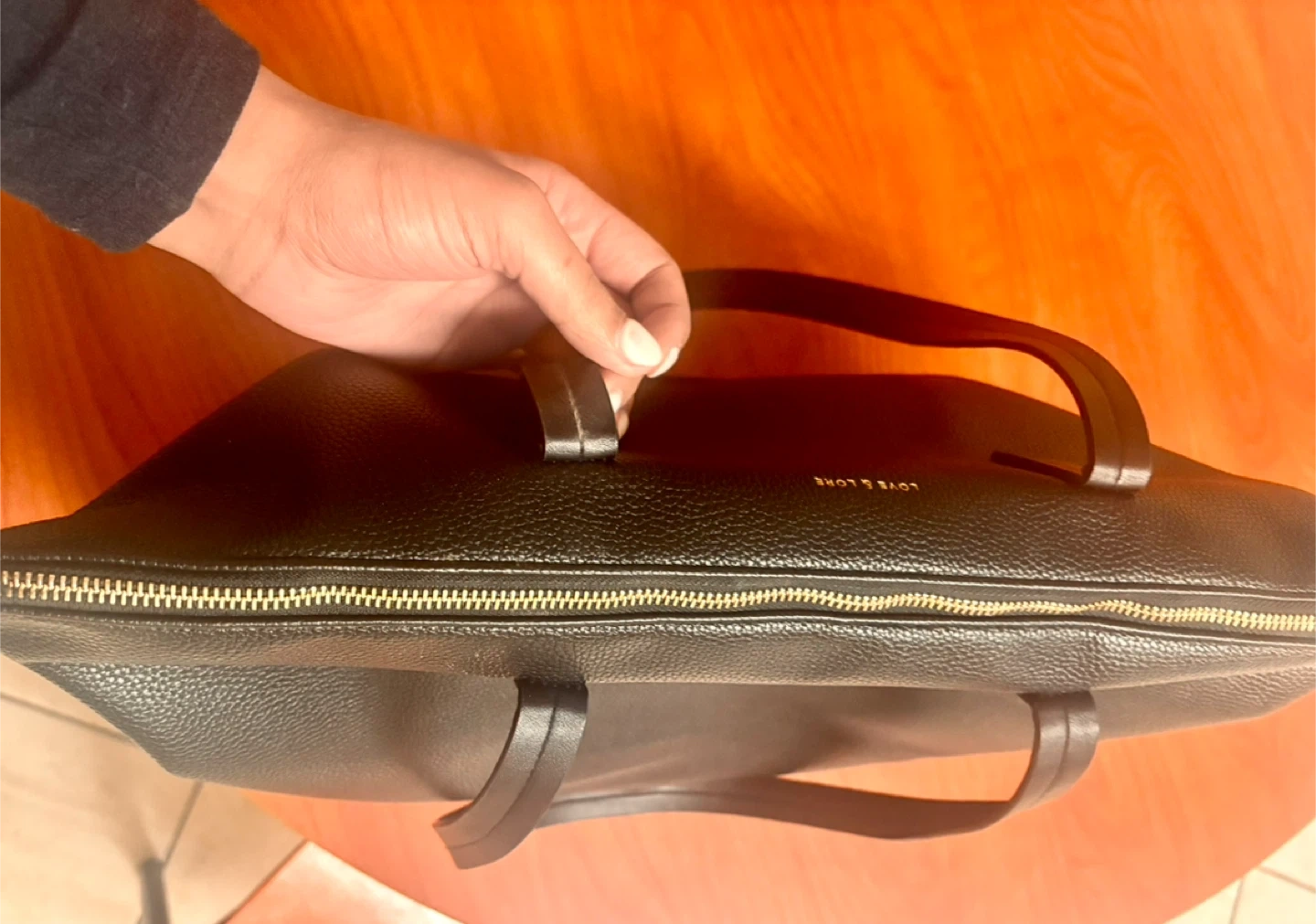 60Looking to pass along this stylish black tote bag from Love & Lore! It's made of faux leather and features a convenient zippered top. Perfect for carrying a water bottle, 14 inch laptop, and an iPad. Relatively new. Just purchased from Indigo in September!